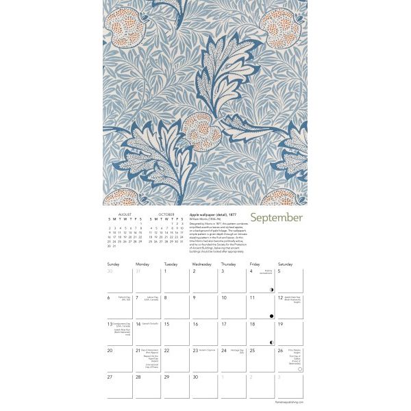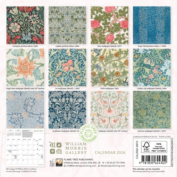 Un calendario mural de formato pequeño que transforma cada mes en una pieza decorativa. Inspirado en los icónicos diseños florales de William Morris, es ideal para quienes disfrutan del arte en los detalles y buscan sumar belleza y estilo a sus espacios durante todo el año.