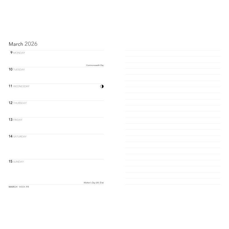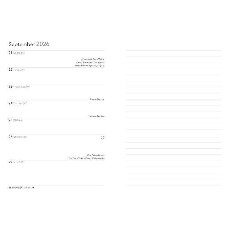 • Agenda semanal con una semana en una página y página con líneas para notas