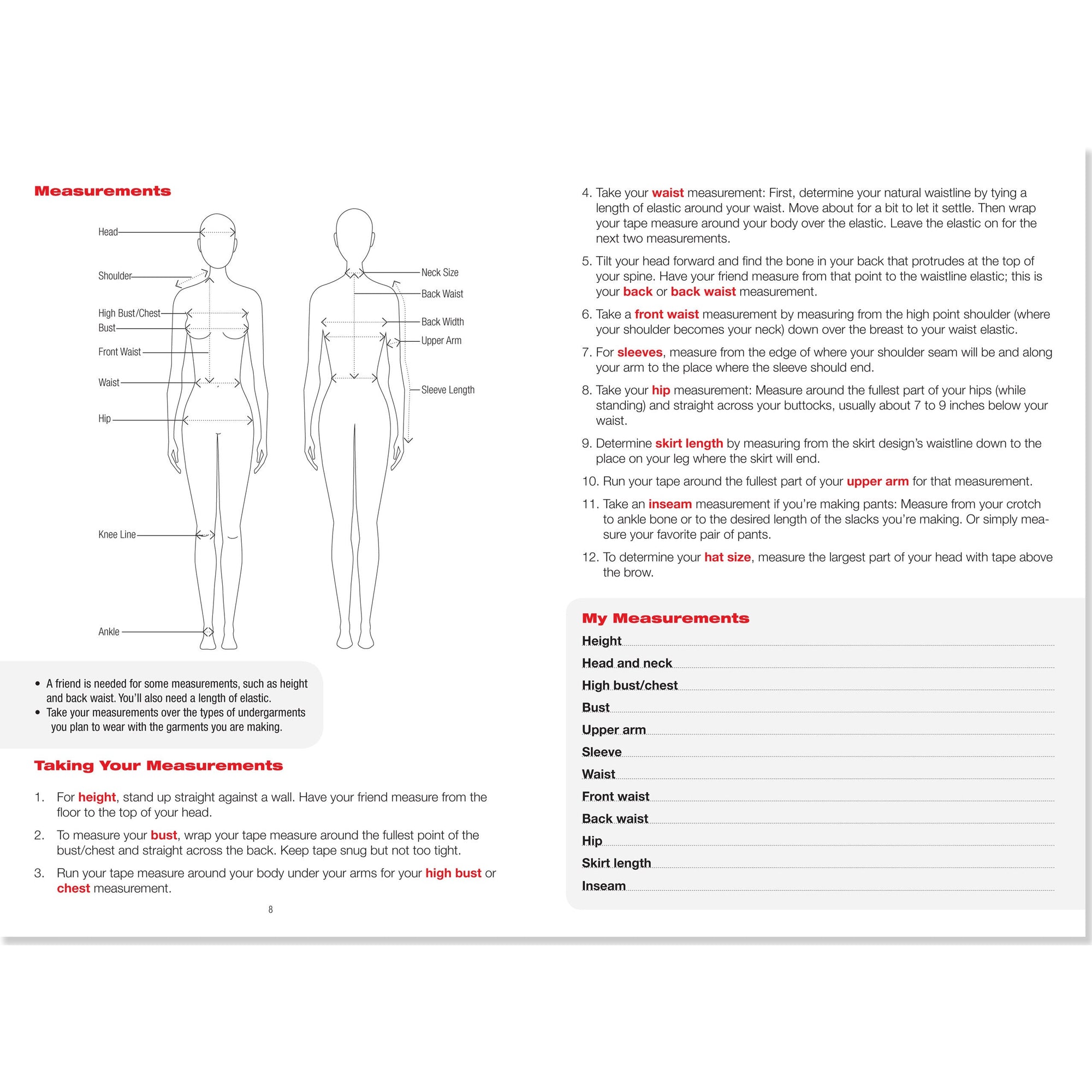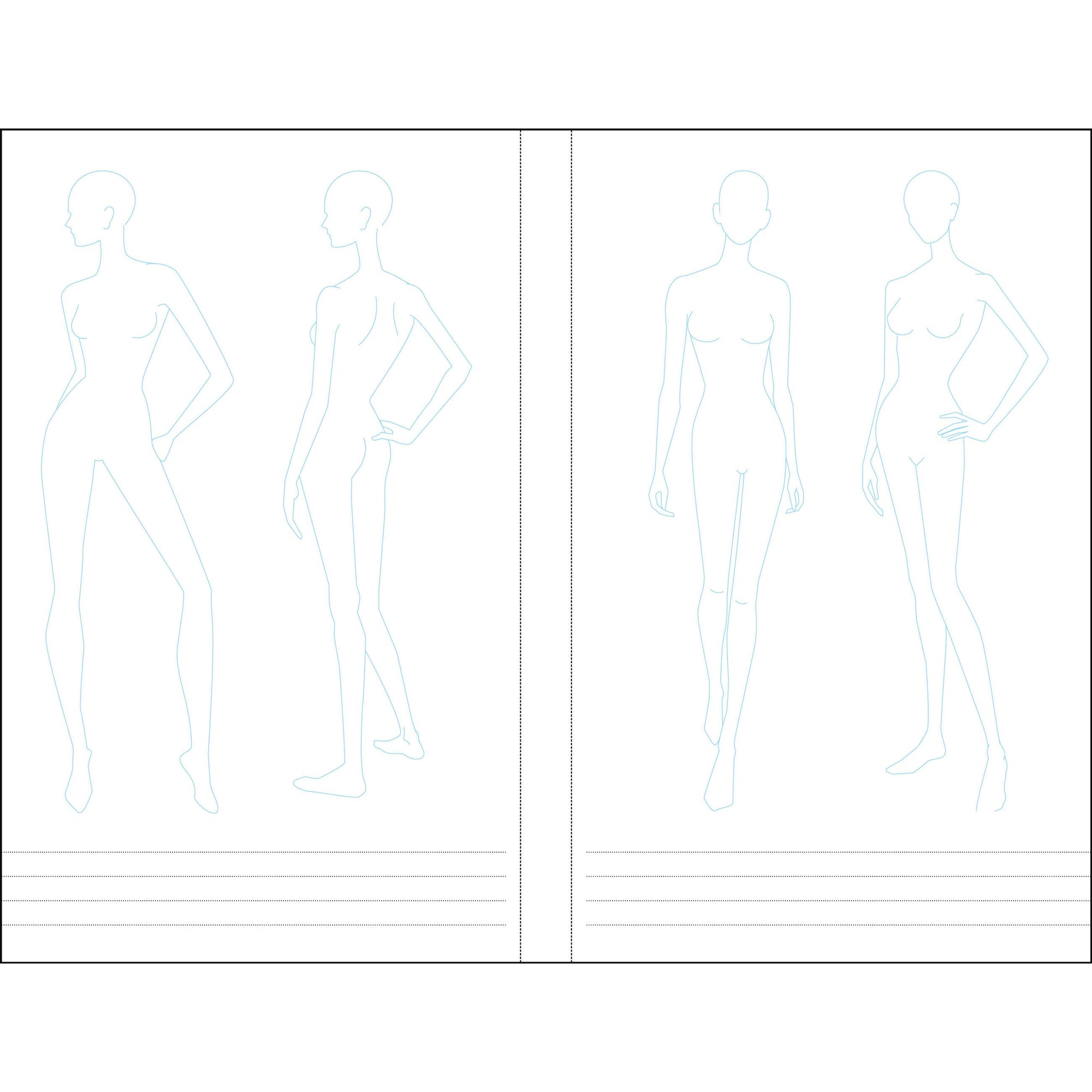 Repleto de figuras ligeramente representadas en poses variadas, este diario te ayudará a darle vida a tus inspiraciones. También hay plantillas de pie para zapatos y cabezas para sombreros o diseños de maquillaje, además de términos y descripciones útiles de la industria, información equivalente al tamaño, ilustraciones de prendas básicas y más