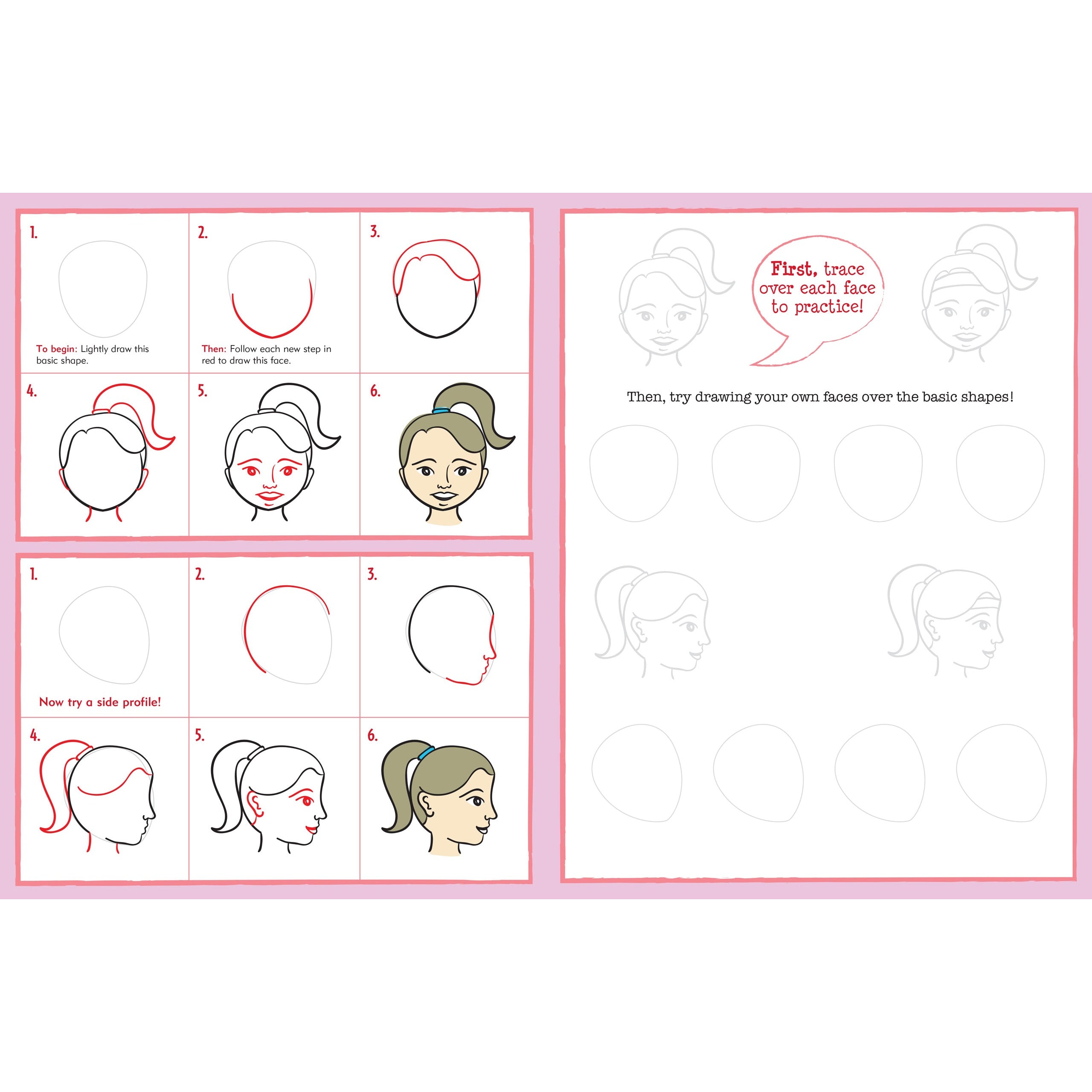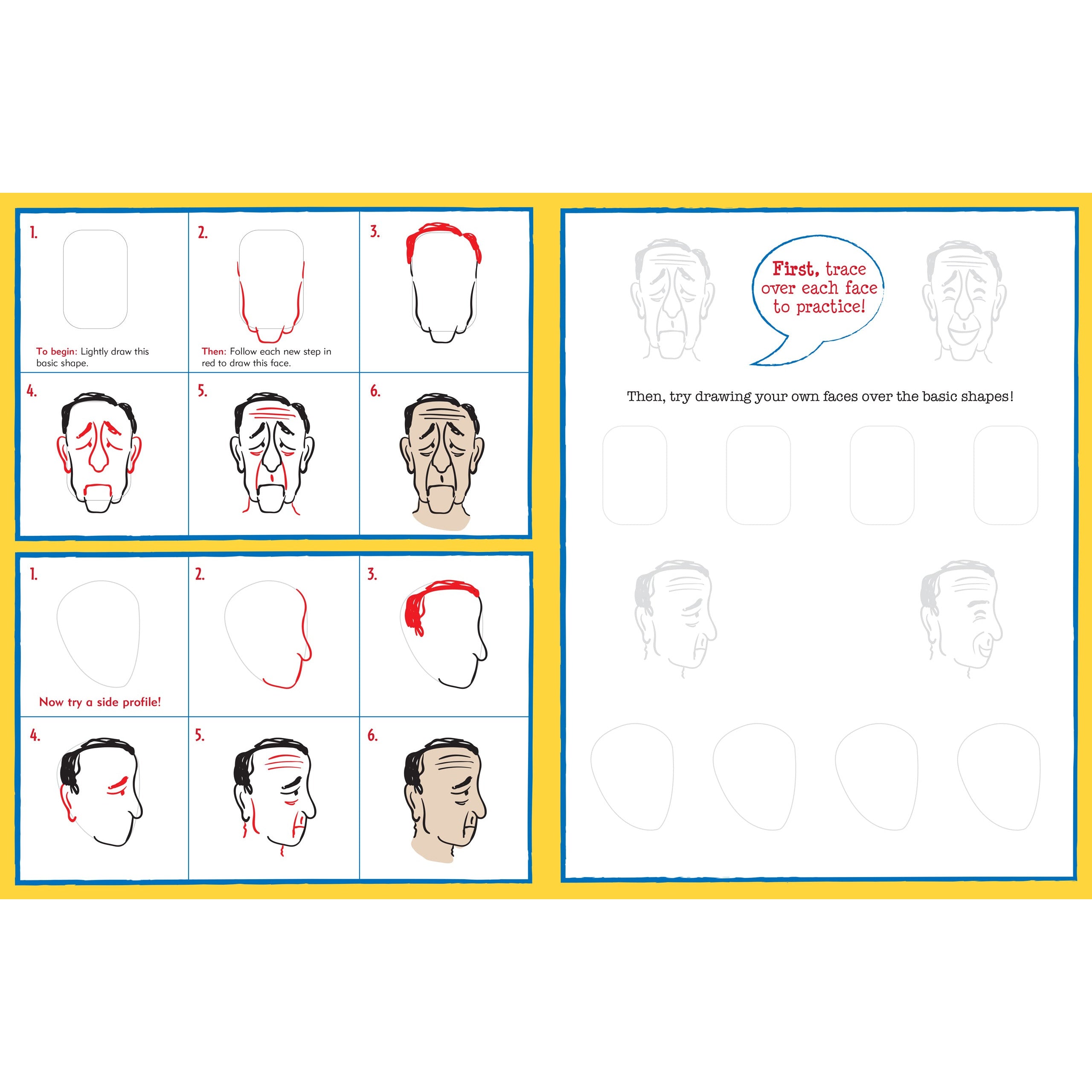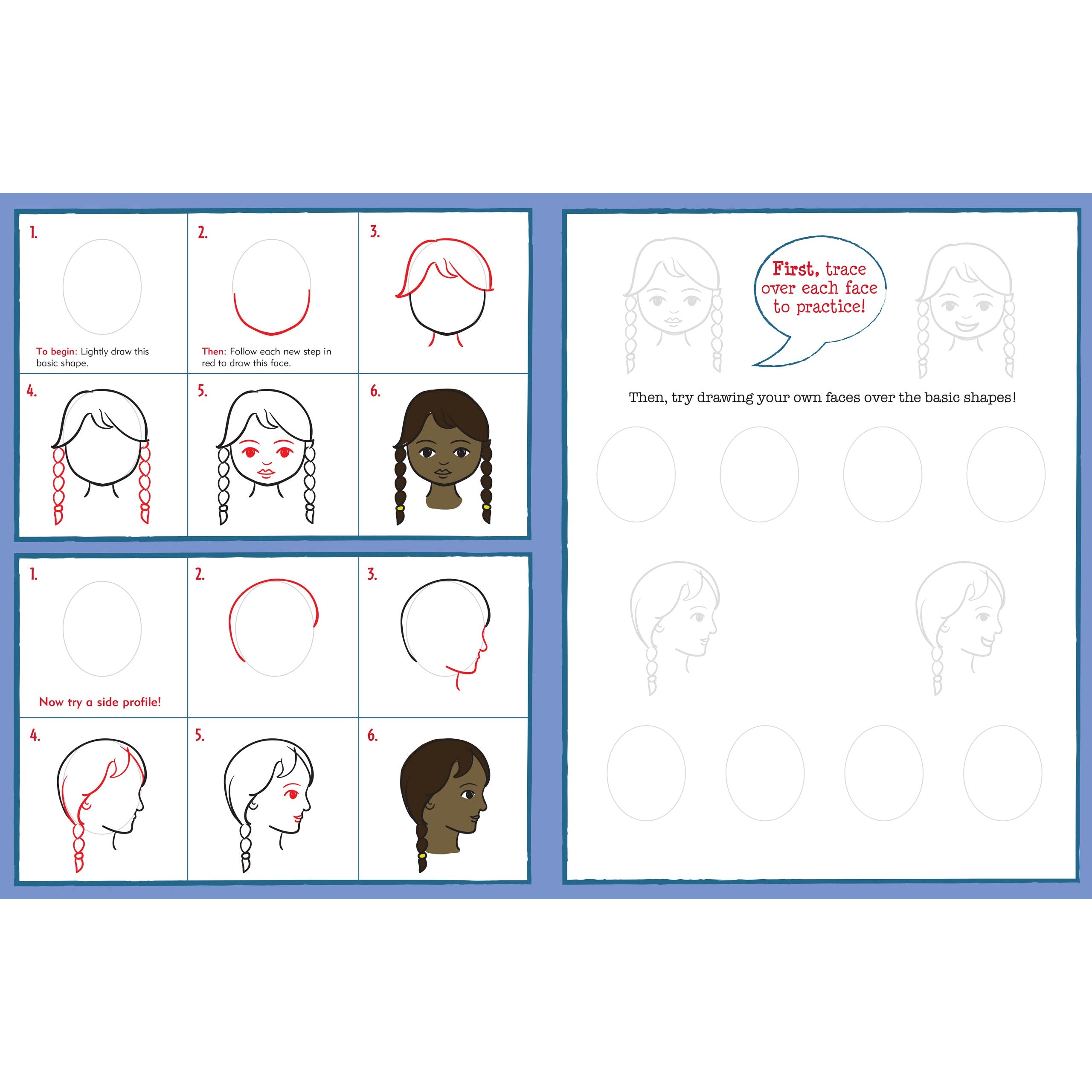 Los jóvenes artistas aprenderán a dibujar más de 40 rostros simplemente trazando contornos útiles y siguiendo ilustraciones paso a paso. Las líneas rojas en cada paso hacen que completar cada dibujo sea muy fácil. ¡Los niños pueden usar sus nuevas habilidades (e imaginación) para dibujar sus propias caras en todo momento!