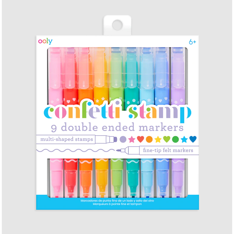 - Un extremo tiene una punta de fieltro fina y el otro extremo presenta marcadores de sello en forma de confeti, puntos, corazones y estrellas.