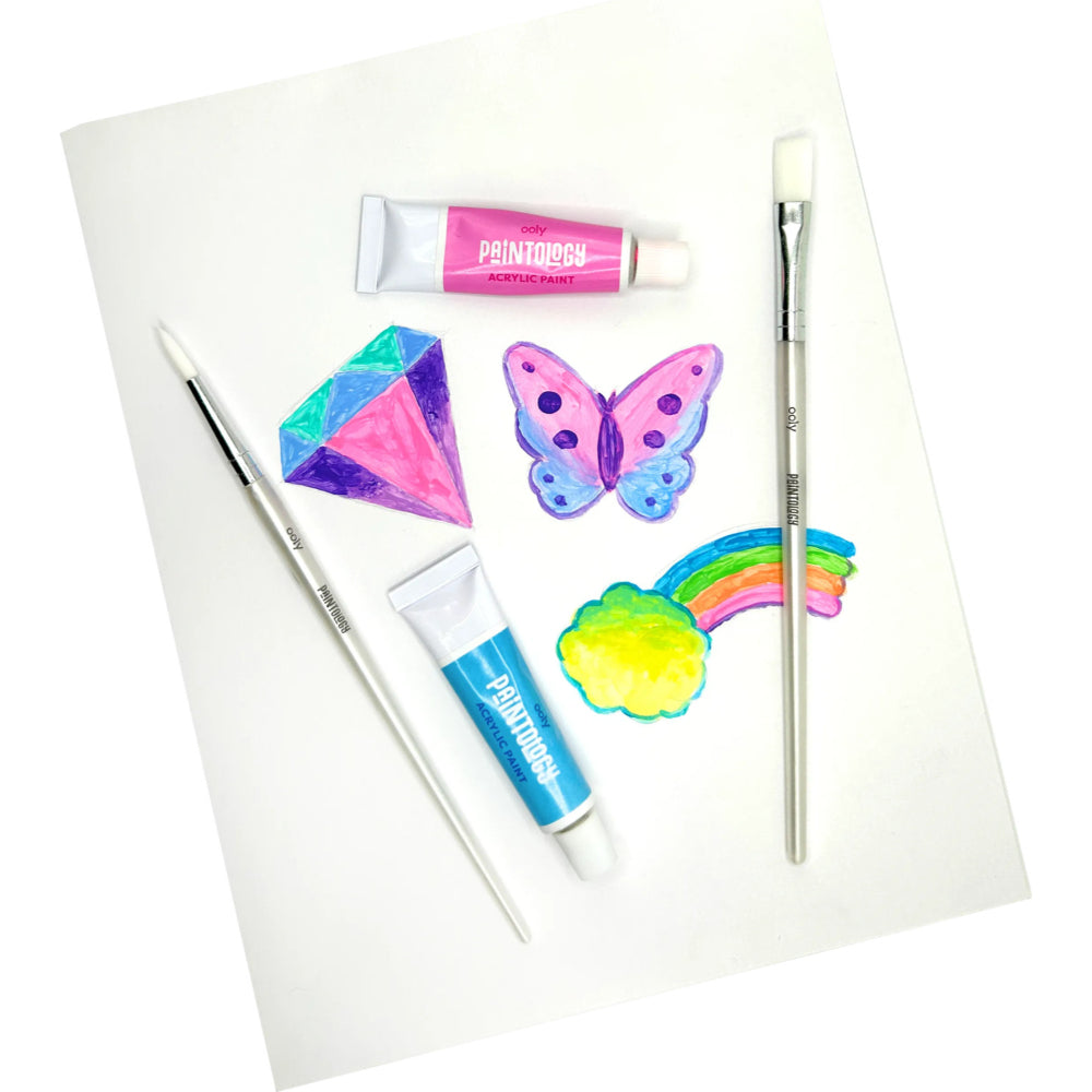- Incluye 12 tubos de pintura acrílica, 2 pinceles (uno fino y otro ancho)