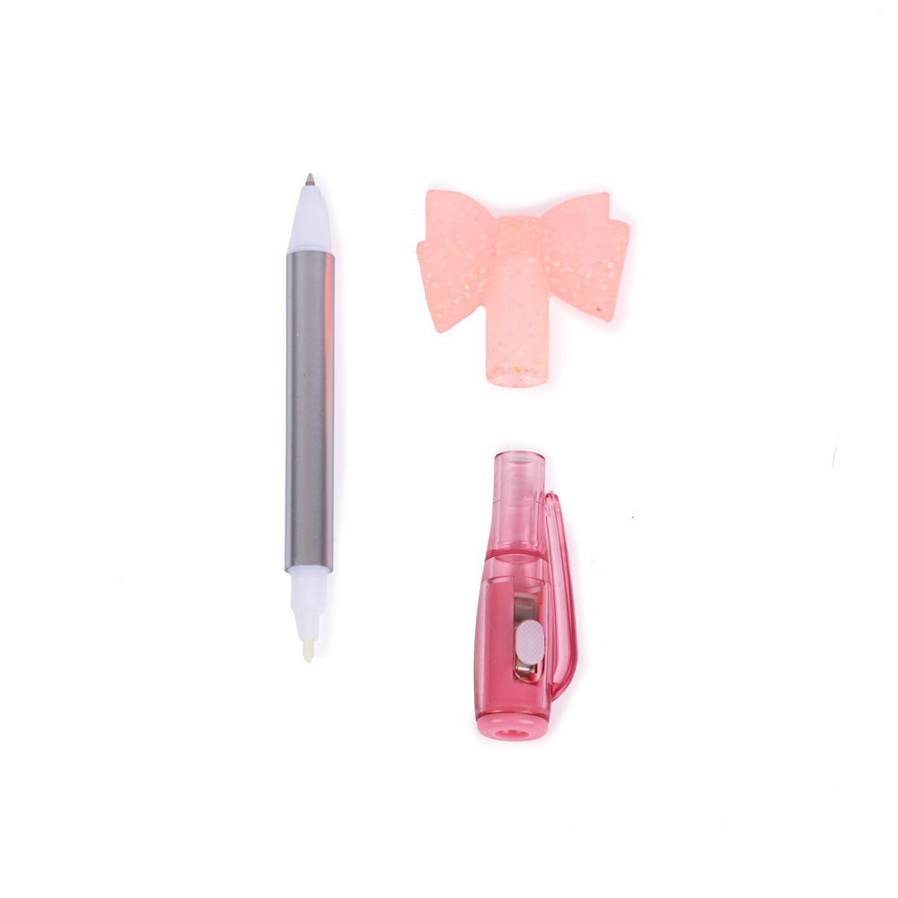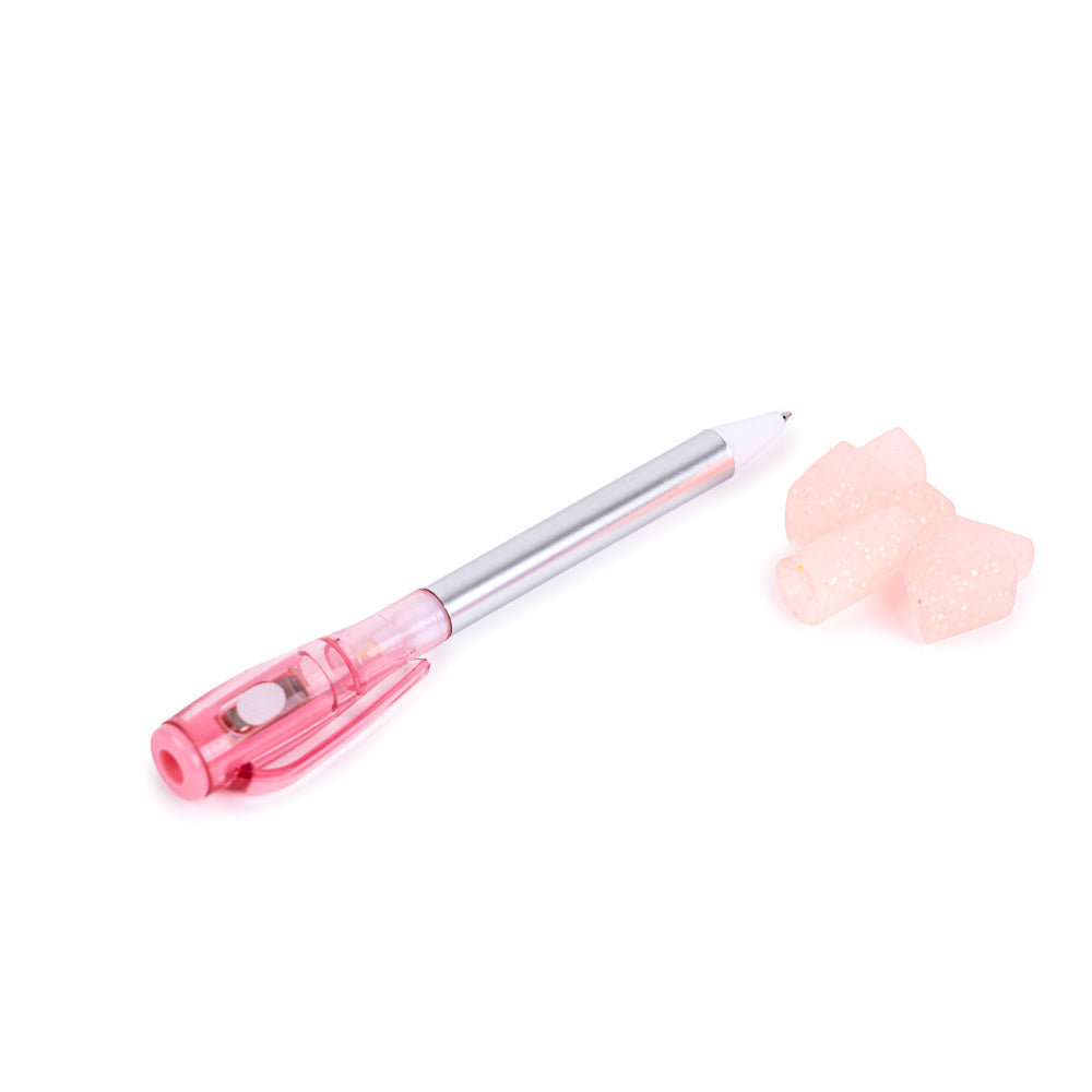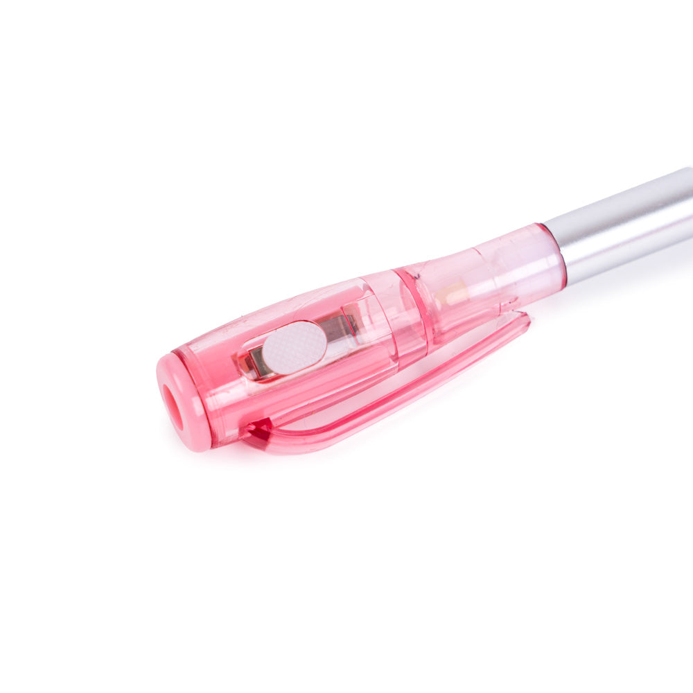 Este bolígrafo con luz y cinta rosada combina funcionalidad y estilo en un solo accesorio. Su luz integrada facilita la escritura en ambientes con poca iluminación, mientras que la cinta rosada añade un toque elegante y femenino.