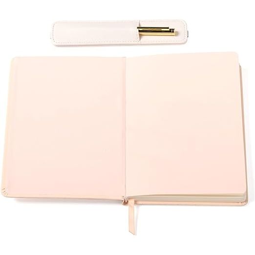 Esta libreta cuenta con una cubierta rosada con relieve dorado, un cierre de banda elástica con un soporte de bolsillo para bolígrafo y bolígrafo incluido