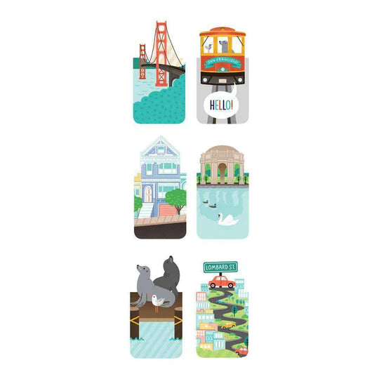 Este set de marcapáginas magnéticos San Francisco de Galison presenta imágenes ilustradas de los monumentos y edificios más famosos de San Francisco. Los seis clips magnéticos troquelados mantienen su lugar y agregan decoración a cualquier página de libro o revista.
