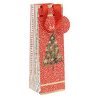 Perfecta para regalar botellas en Navidad, esta bolsa combina un fondo rojo con un pino decorado en dorado y detalles festivos. Los bordes metálicos y el lazo de cinta añaden un toque sofisticado, mientras que su diseño alegre transmite el espíritu cálido y tradicional de la temporada.