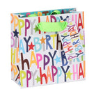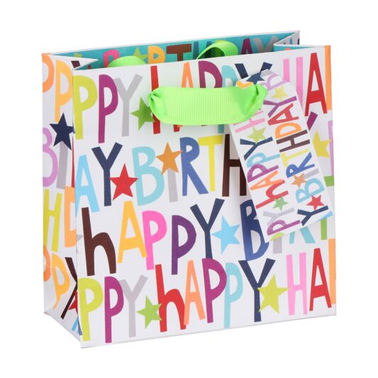 ¡Dé un regalo en una elegante bolsa de Glick! La bolsa de regalo blanca está adornada con un texto divertido y colorido que dice FELIZ CUMPLEAÑOS, intercalado con estrellas. La bolsa pequeña presenta asas anchas de cinta verde luminosa y viene completa con una etiqueta de regalo correspondiente con espacio para que personalices tu propio mensaje.