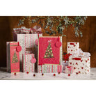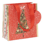 Perfecta para regalos navideños medianos y elegantes, esta bolsa combina un fondo rojo con un árbol de Navidad decorado en dorado y detalles festivos. Los bordes metálicos y el lazo de cinta añaden un toque sofisticado, mientras que su diseño alegre transmite el espíritu cálido y tradicional de la temporada.