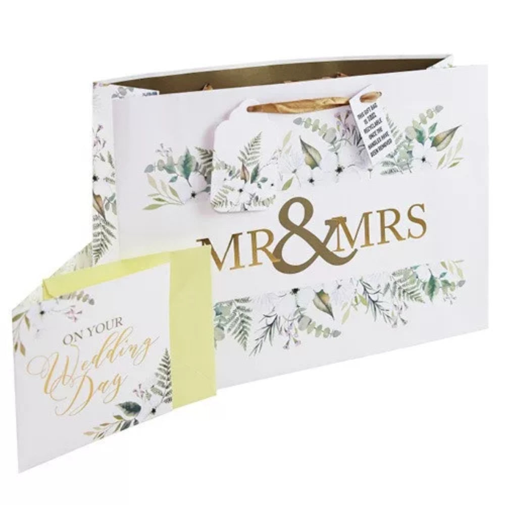 ¡Asegura tu regalo con la Bolsa Regalo Shopper Mr and Mrs! Ideal para bodas y aniversarios, esta bolsa resistente tiene el mensaje "Mr and Mrs" y presenta un estilo elegante. ¡Sorprende a la pareja con una presentación digna de ellos!