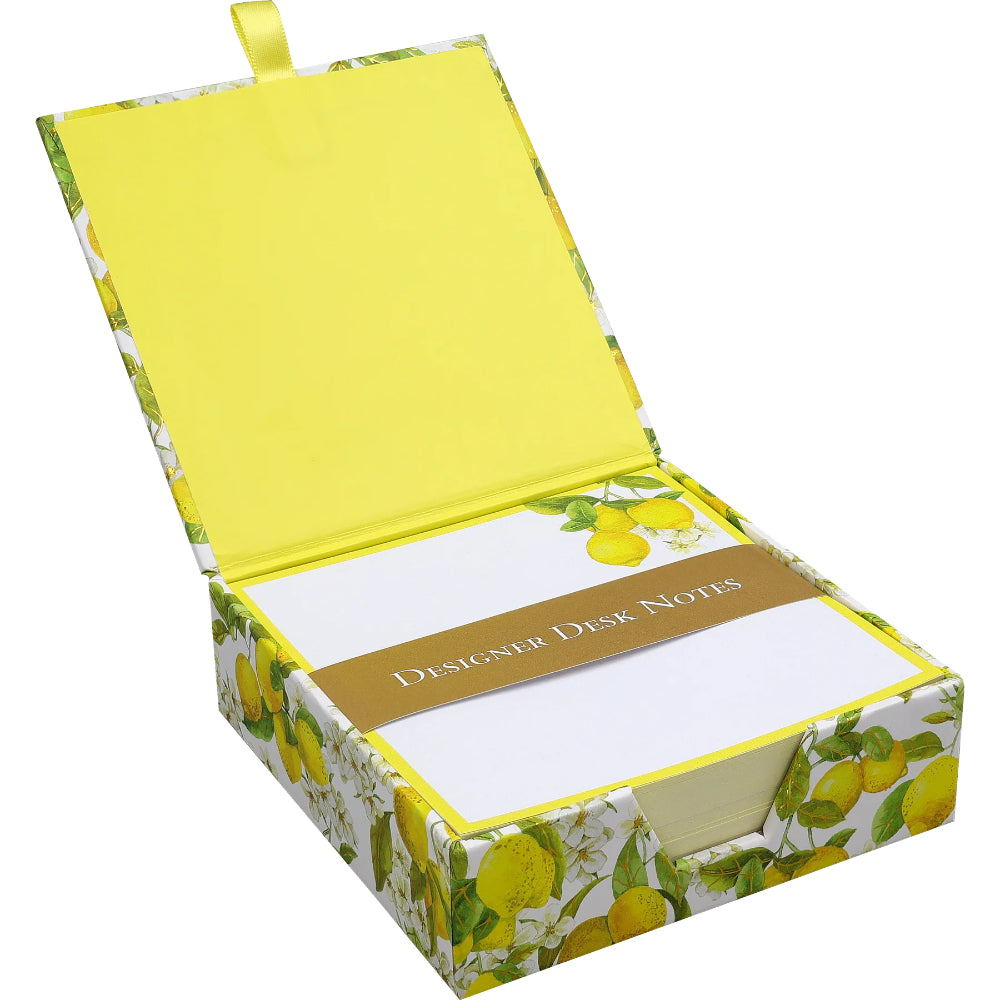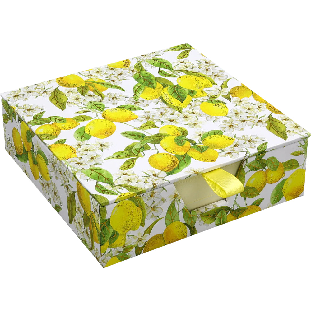 Anota tus pensamientos, recordatorios e ideas con elegancia en estas hojas de notas únicas. Guardadas en una práctica caja, siempre estarán al alcance cuando las necesites. Su diseño vibrante, inspirado en los limones soleados de la costa Amalfitana, incluye detalles en papel dorado hechos a mano. Cada hoja muestra un detalle colorido del diseño en la esquina superior derecha, combinando funcionalidad y estilo.