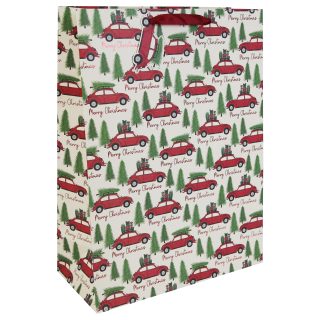 Bolsa grande de regalo con autos rojos navideños que transforman cualquier presente en algo especial. Perfecta para empaques grandes, resistente y reutilizable para celebraciones memorables.