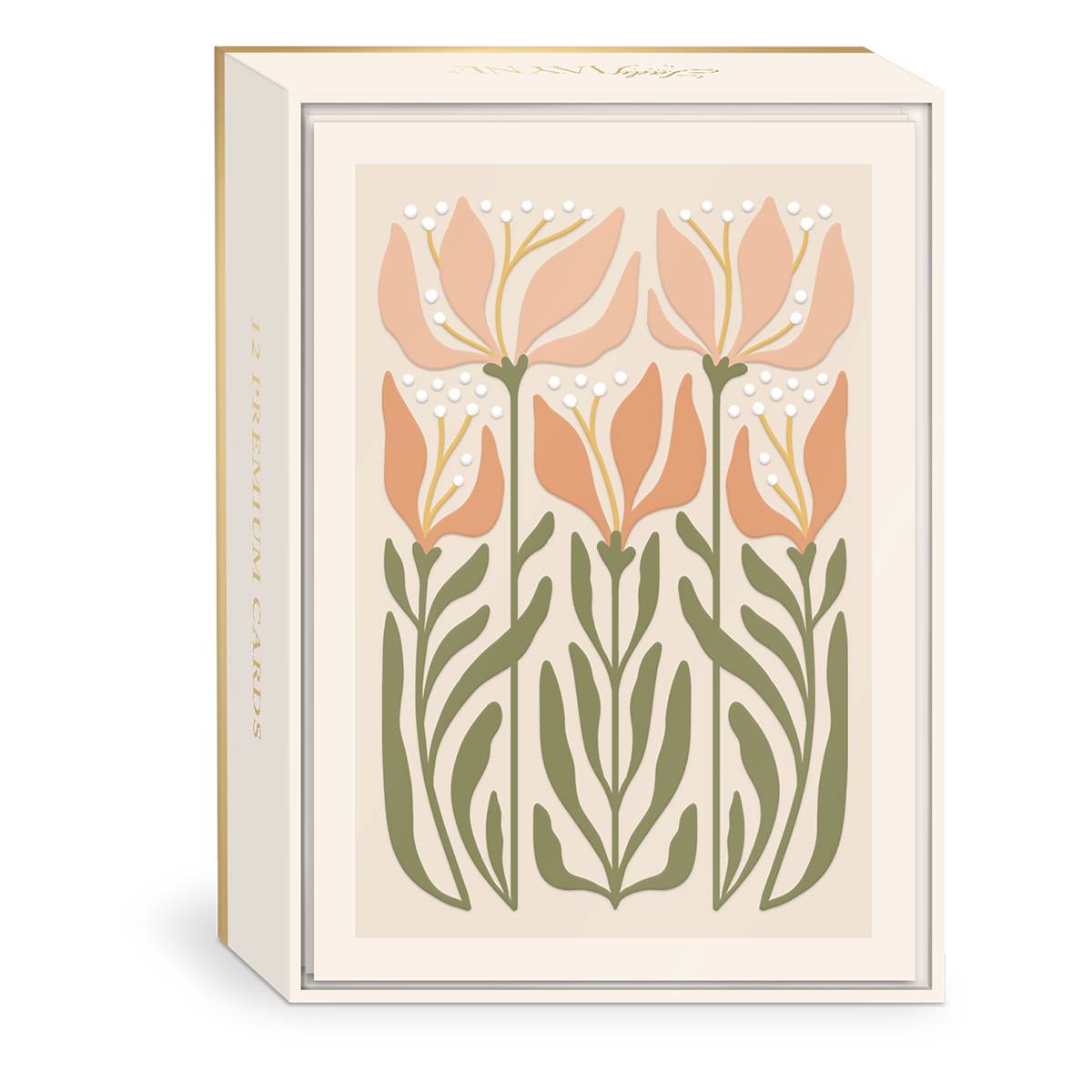 - Juego de 12 tarjetas con relieve y sobres forrados con papel dorado.
