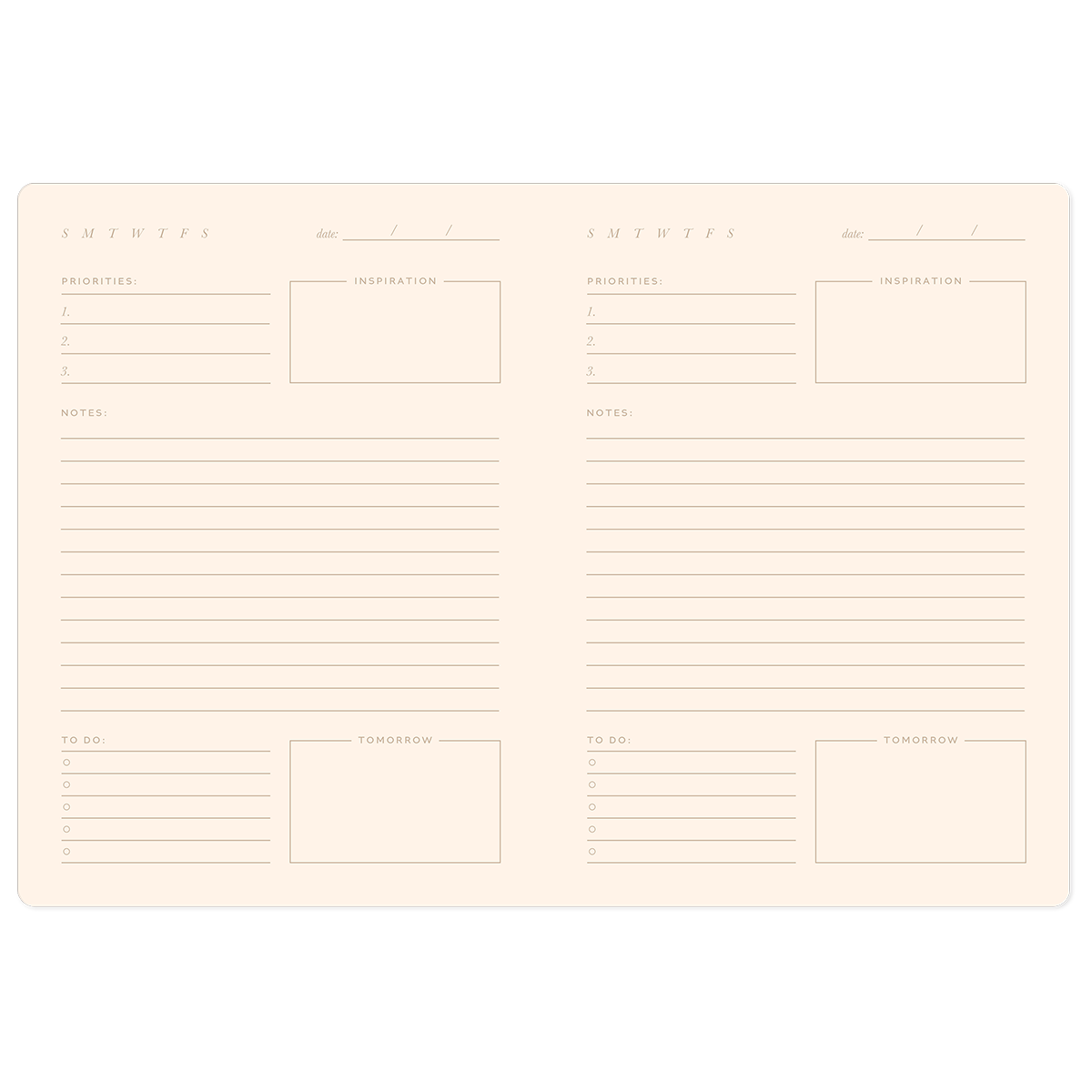 - Páginas de planificación diaria con prioridades, inspiración del día, notas, cosas que hacer, y cuadro para el día siguiente.