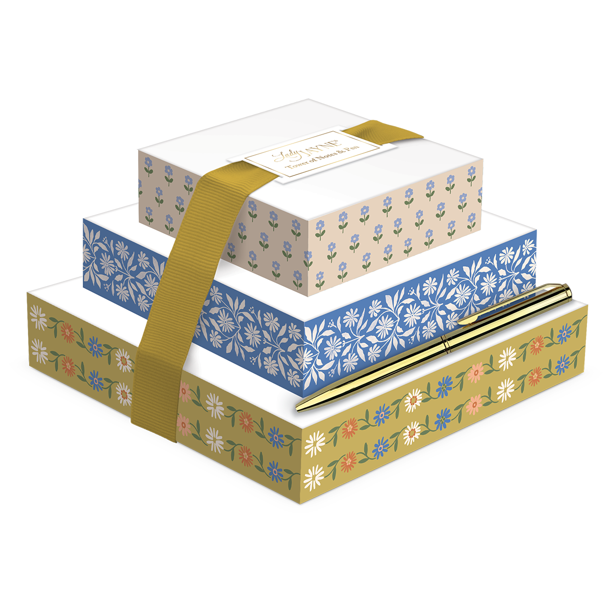 - Tres tacos de notas apilados, con bolígrafo y cinta de metal dorada.