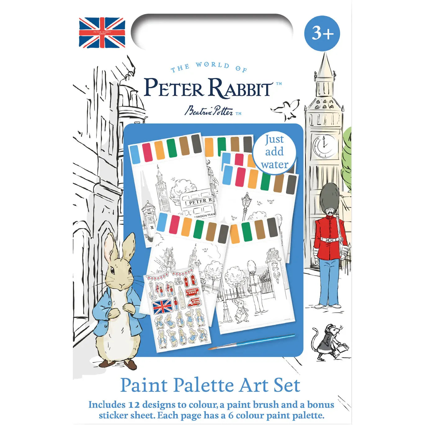 Da vida a Peter Rabbit con este adorable set de arte con paleta de pintura. El set incluye una selección de 12 diseños predibujados y un pincel, y con 6 pinturas en cada página solo necesitas agregar agua para empezar a pintar. Los diseños predibujados presentan al querido personaje Peter Rabbit, de las historias de Beatrix Potter, visitando famosos monumentos y edificios de Londres.