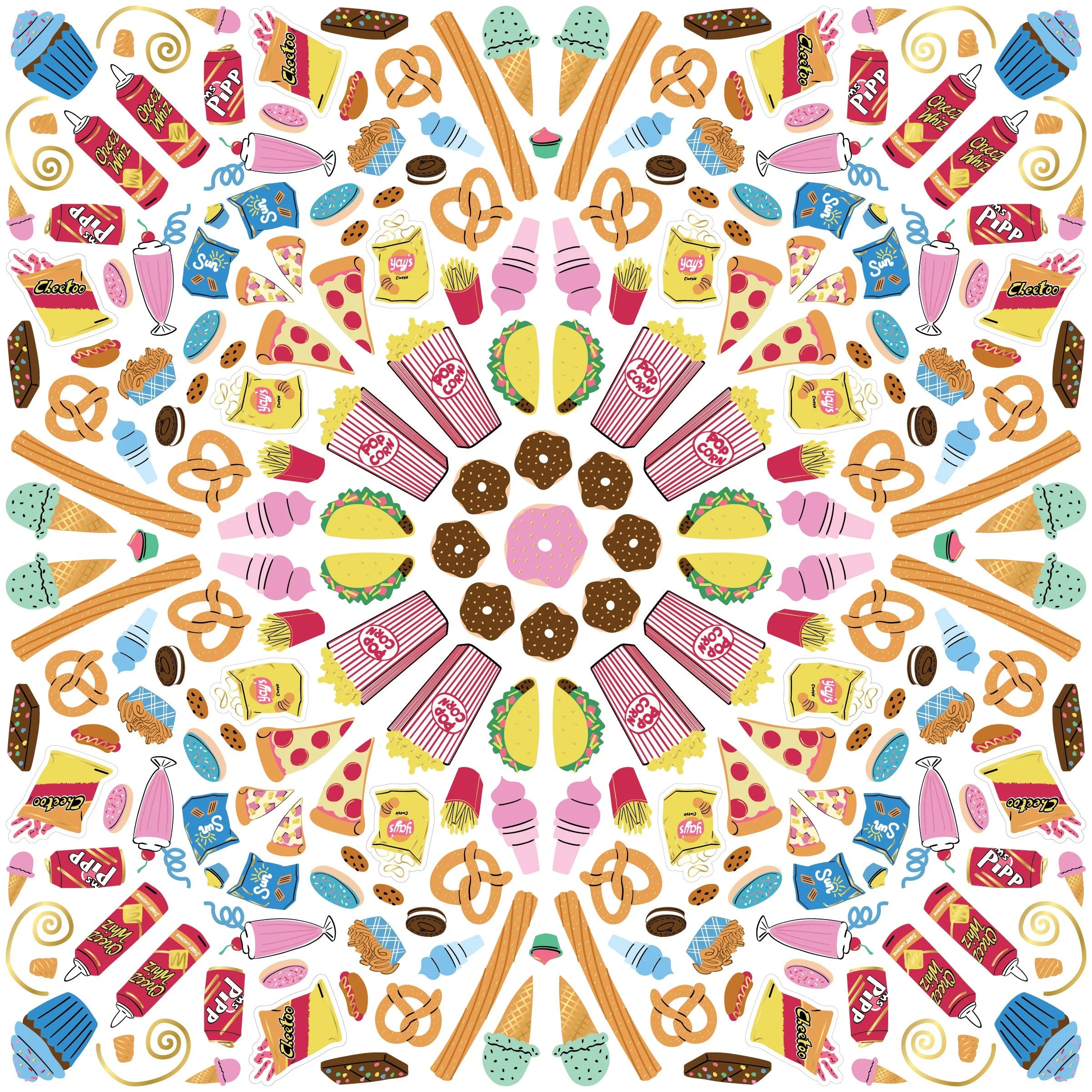 ¡Un mandala con tu comida favorita! Un estallido creativo hecho de tus snacks y dulces favoritos. Este kit te invita a armar tu propio mandala ilustrado con stickers irresistibles: helados, papitas, gomitas, refrescos y más, todo en un caos delicioso y colorido. Perfecto para regalarte un momento de juego, arte y pura felicidad visual.