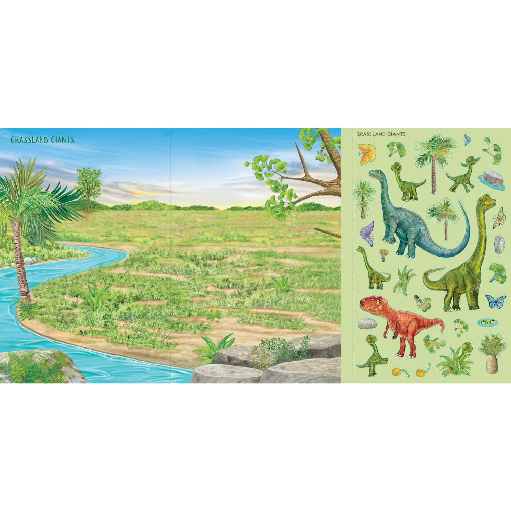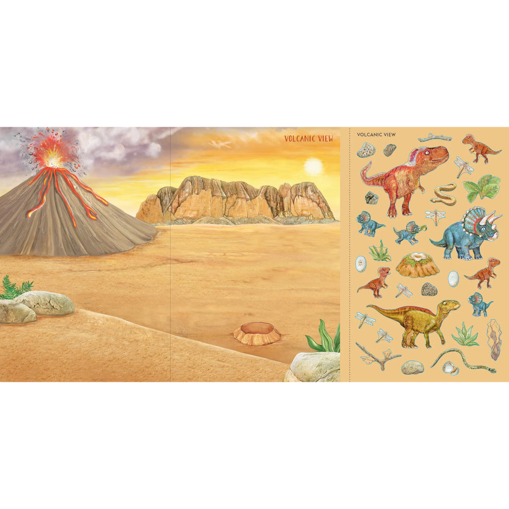 Sumérgete en la era prehistórica y diseña tu propio mundo de dinosaurios. Escoge entre stickers de tus dinosaurios favoritos, criaturas voladoras antiguas, reptiles acuáticos y mucho más. Coloca los stickers en las escenas de fondo para dar vida a tus creaciones. Con 11 escenas para personalizar, podrás mostrar tus diseños fácilmente gracias a las páginas perforadas. Esta actividad interactiva estimula la imaginación y el juego autónomo, ideal para entretener sin pantallas durante viajes, días lluviosos o vacaciones.