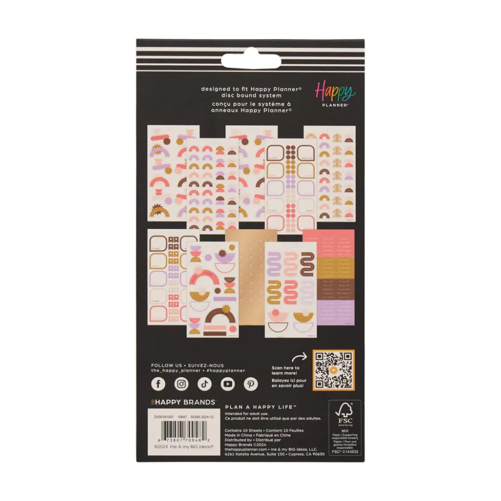 Un set de stickers pensado para darle un toque especial a tu agenda. Sus formas geométricas y su paleta en lila, coral, rosa y dorado crean una combinación elegante y armónica, perfecta para organizar y decorar tus páginas con estilo.