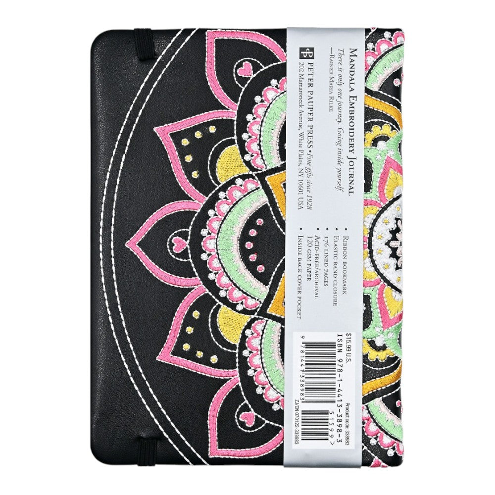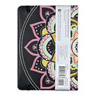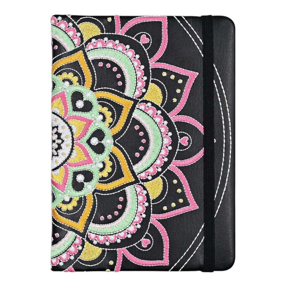 Esta libreta cuenta con una cubierta de cuero vegano suave, costuras y relieves decorativos y un colorido diseño de mándala.
