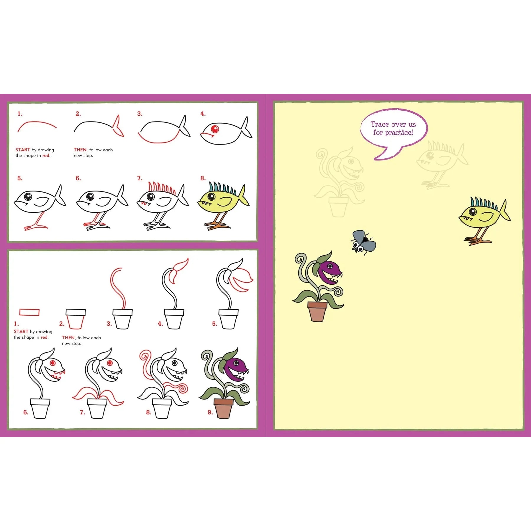 - Las líneas de guía rojas en cada paso que hacen que completar cada dibujo sea simple, fácil, satisfactorio y DIVERTIDO