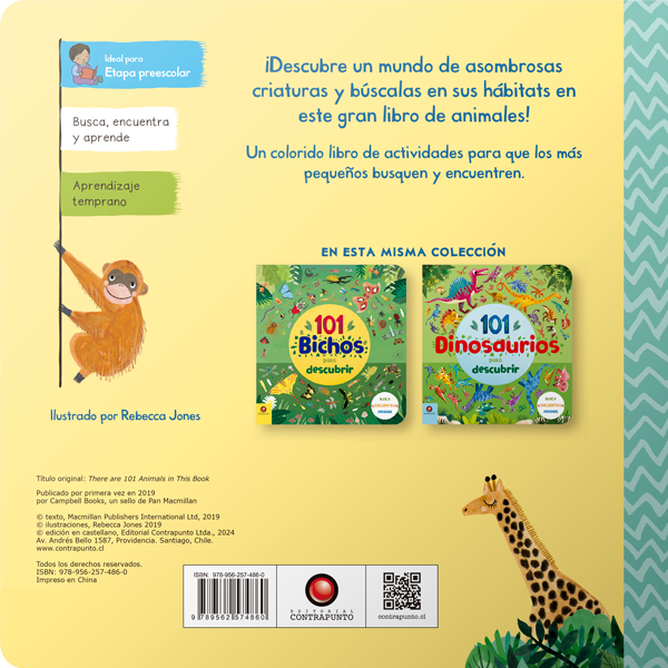 101 animales para descubrir forma parte de una nueva serie de aprendizaje temprano para niños y niñas que comienzan a explorar el mundo que los rodea. Las páginas de cartón con simpáticas ilustraciones estimulan las habilidades de localización y búsqueda mientras los pequeños aprenden los nombres de los animales y relacionan cada grupo con su entorno.