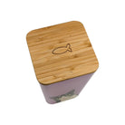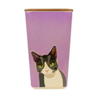 Mantén los snacks de tu gato frescos y a mano con este encantador contenedor. Fabricado con bambú ecológico, presenta un diseño moderno en color lavanda ilustrado con la mirada tierna e inquisitiva de un gatito. Su tapa de bambú sella perfectamente y está decorada con el sutil detalle de un pez grabado. Es el accesorio perfecto para organizar con estilo en la cocina o donde tu prefieras.