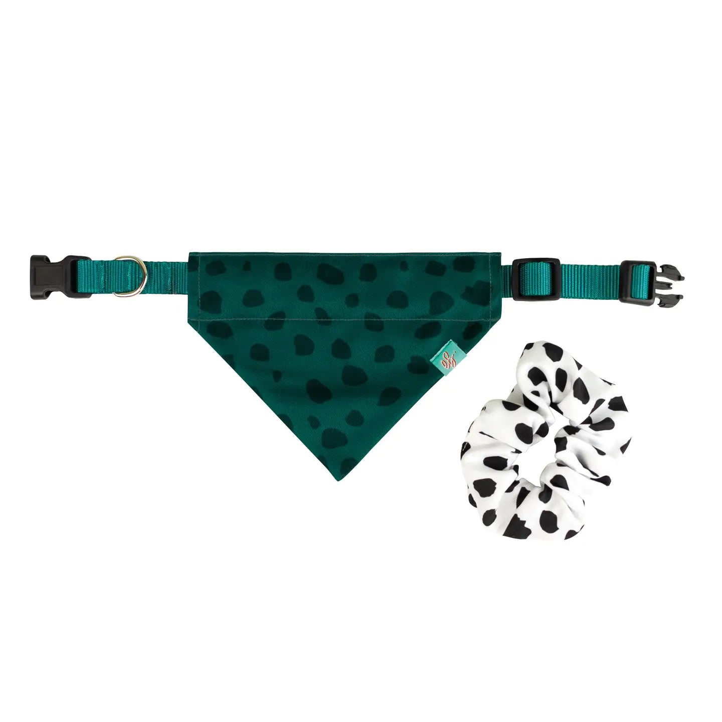 Este set es el dúo de diseño perfecto para ir a juego con tu mejor amigo. Incluye una Bandana - Collar con un vibrante print dálmata en verde oscuro, y un Scrunchie a juego con el diseño clásico de manchas en blanco y negro para ti.