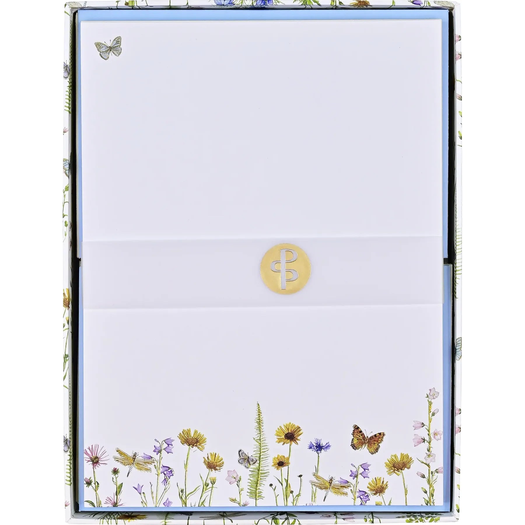 ¡Mantente conectado! Toma el bolígrafo en la mano y deja que estas hermosas hojas de cartas aporten estilo a tu correspondencia. ¡Disfruta del fino arte de escribir cartas y alegra su día con una nota personal! Mariposas, libélulas, helechos y flores de tonos suaves se combinan con adornos de lámina dorada brillante y un fondo blanco mate.