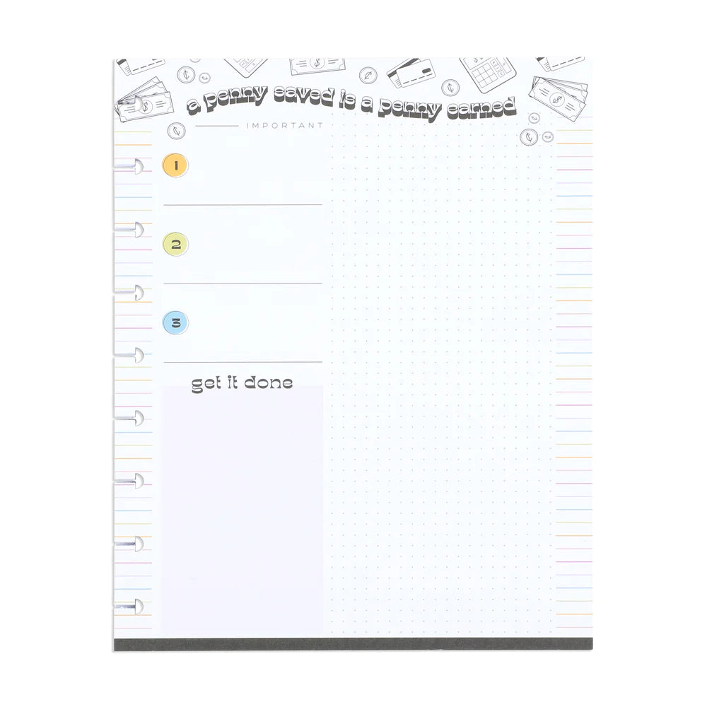 ¡Lleva un registro de tus gastos semanales con este práctico block con 100 hojas! Las hojas de notas vienen en tamaño classic y puedes agregar fácilmente estas páginas a tu Budget Happy Planner. Úsalo como un lugar para priorizar tus gastos y escribir notas adicionales.
