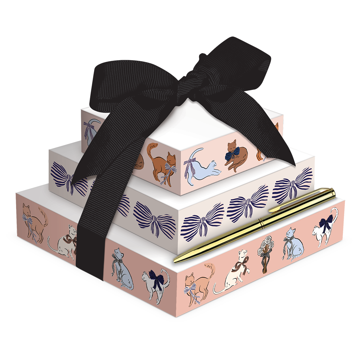- Tres tacos de notas apilados con bolígrafo metálico dorado y lazo decorativo