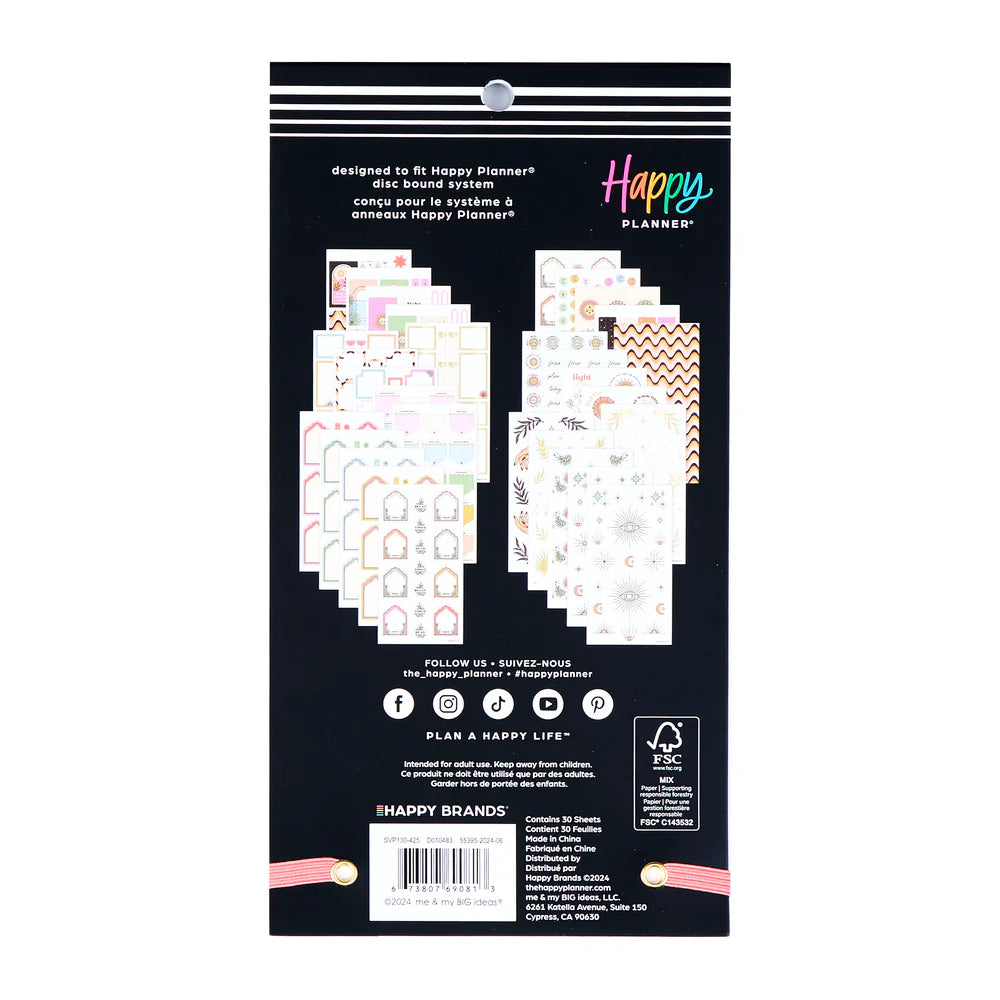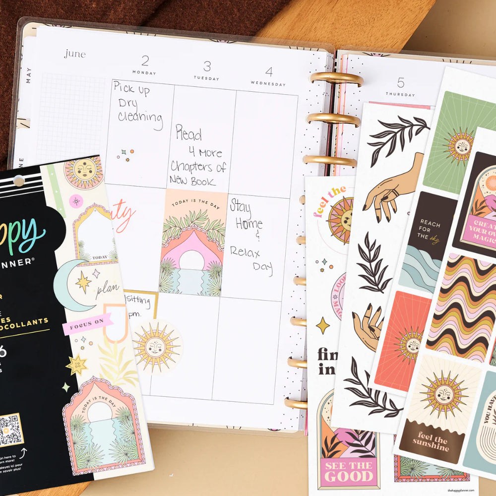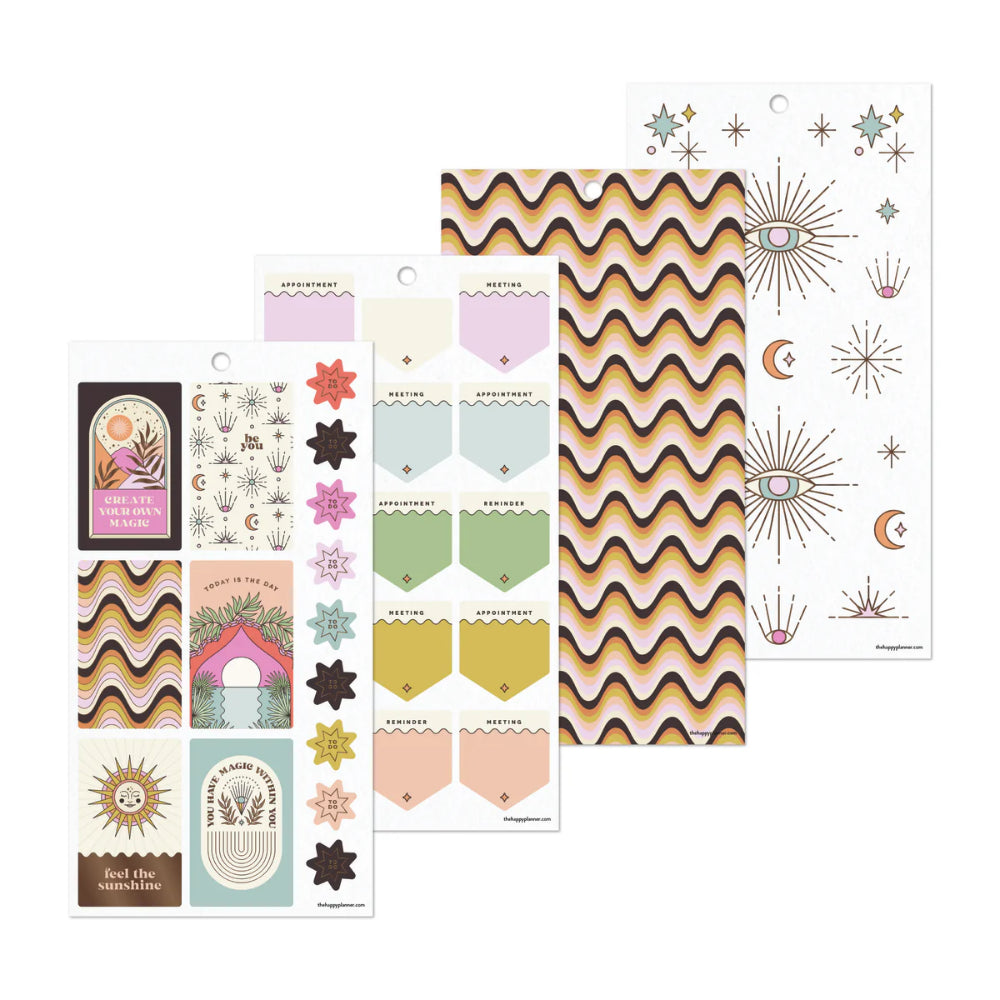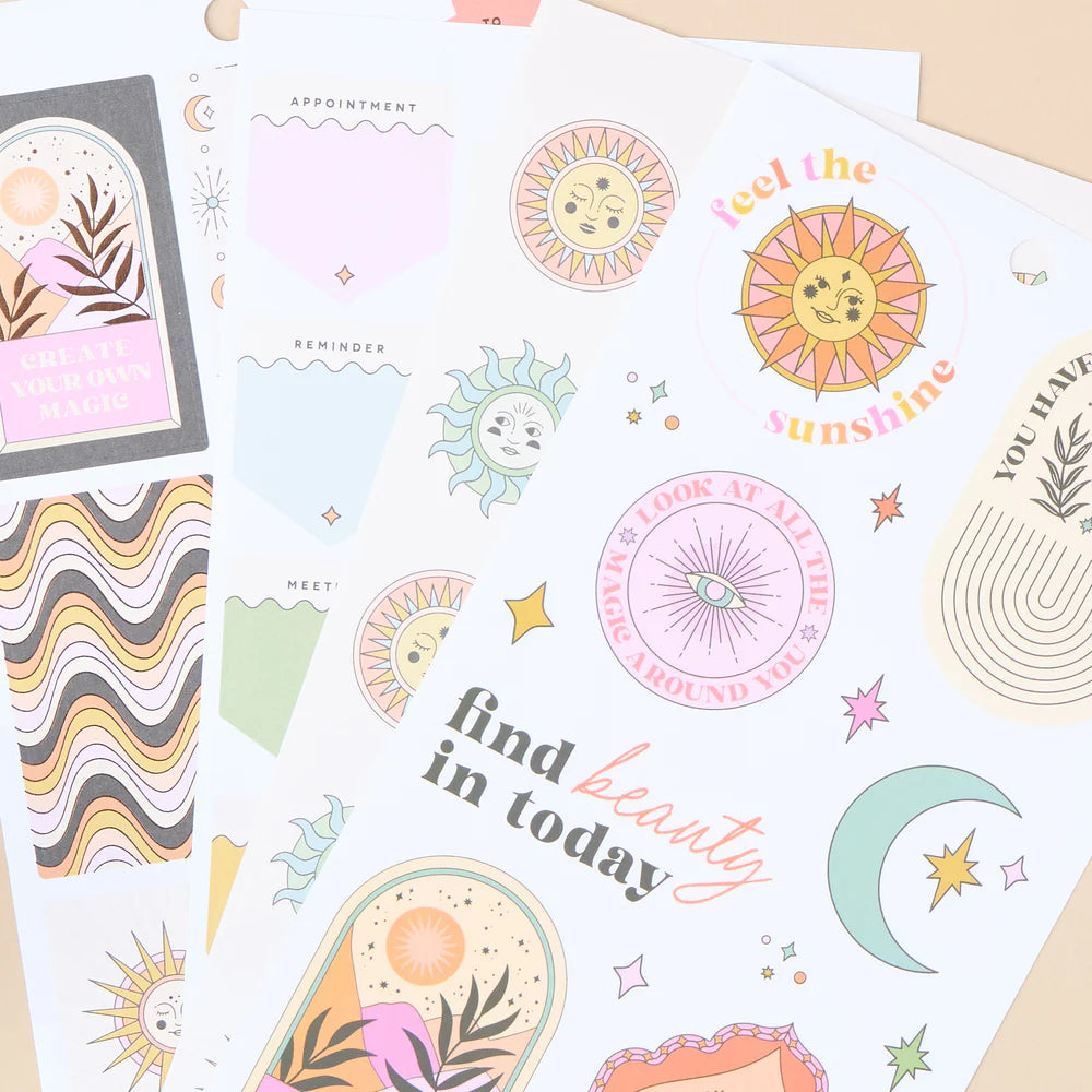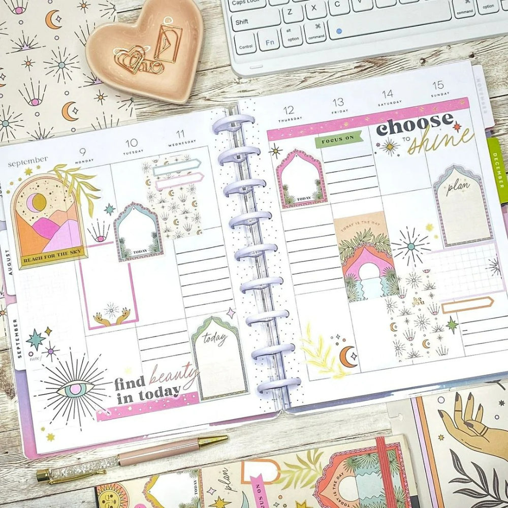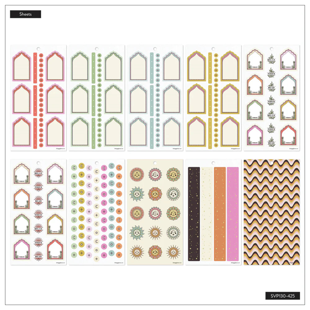 Pack de stickers decorativos y funcionales inspirados en la estética bohemia del desierto, con tonos cálidos, motivos místicos y detalles naturales. Diseñado para planners en formato Classic, incluye etiquetas para fechas, recordatorios, frases inspiradoras y elementos decorativos que aportan un aire relajado y espiritual a tu planificación diaria.