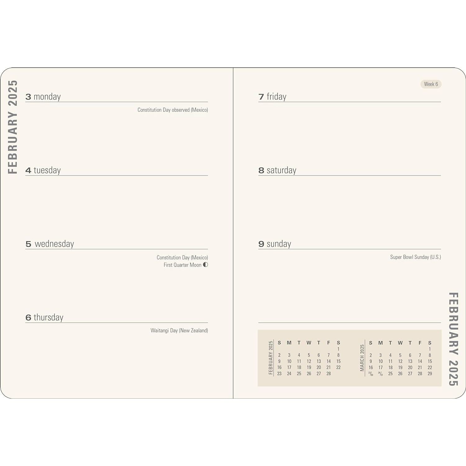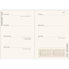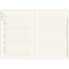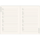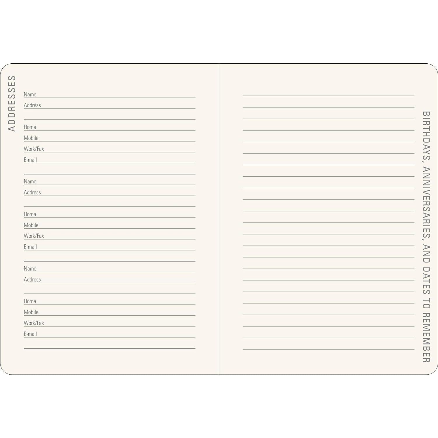 - Incluye páginas en la parte posterior con espacio para registrar direcciones de contacto y fechas para recordar, un marcador de páginas de cinta y un bolsillo al interior de la tapa trasera que se expande para guardar notas, tarjetas y otros artículos planos