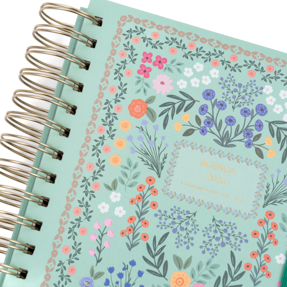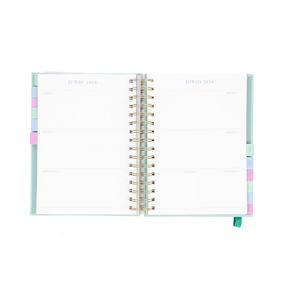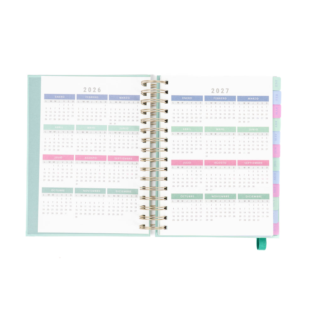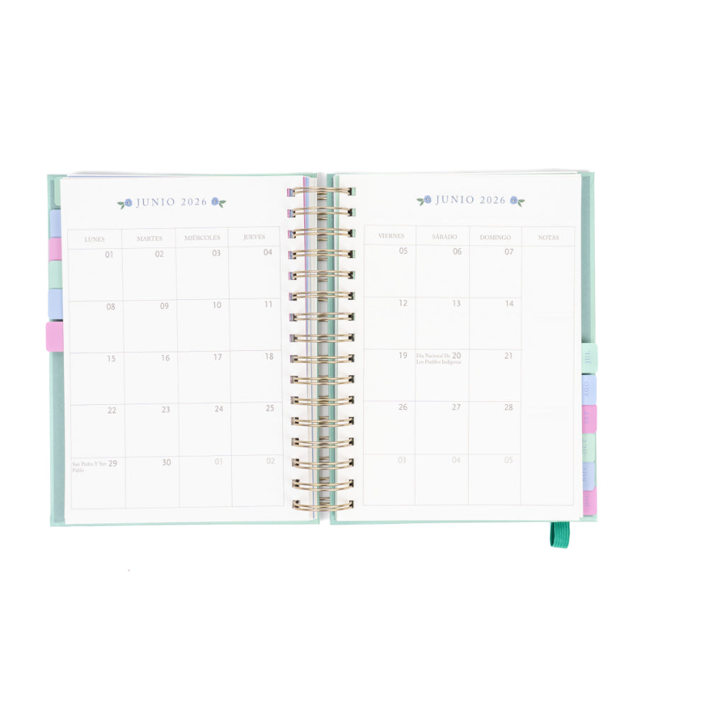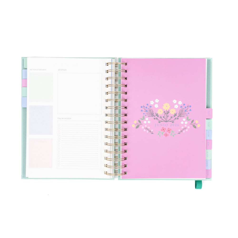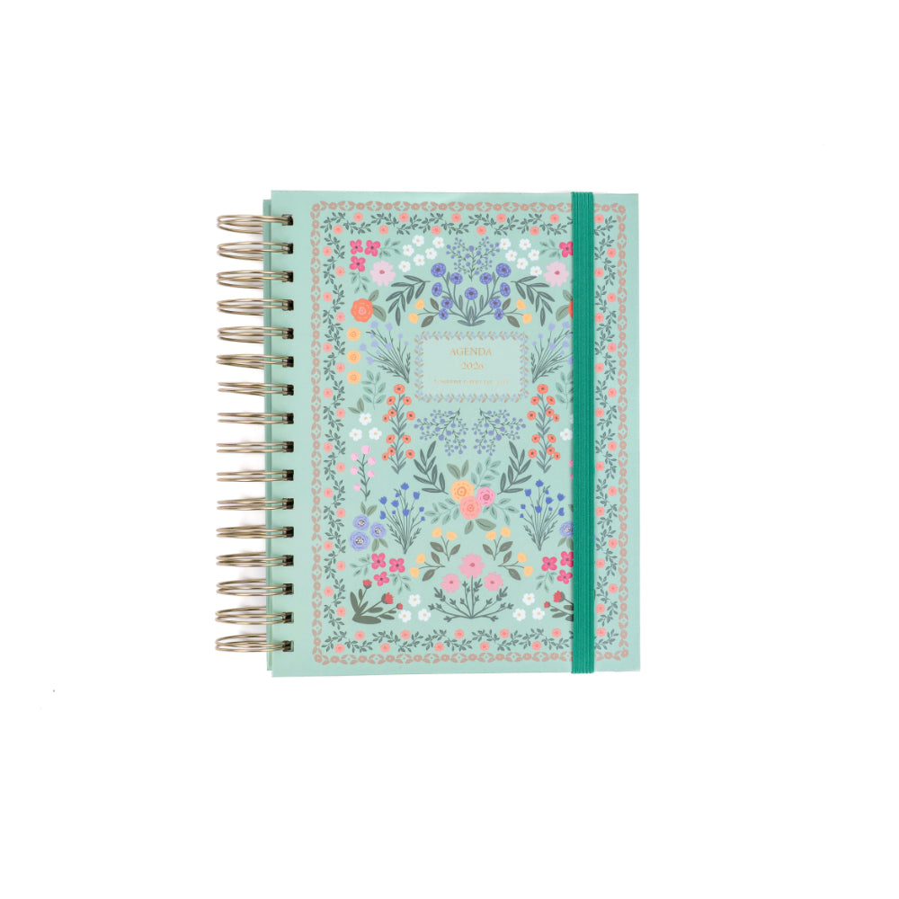 Organiza tu año 2026 con estilo y practicidad usando esta agenda anillada mediana de 12 meses. Su diseño semanal te permite planificar cada semana con detalle, mientras que su elegante cubierta verde floral aporta frescura y personalidad a tus días.