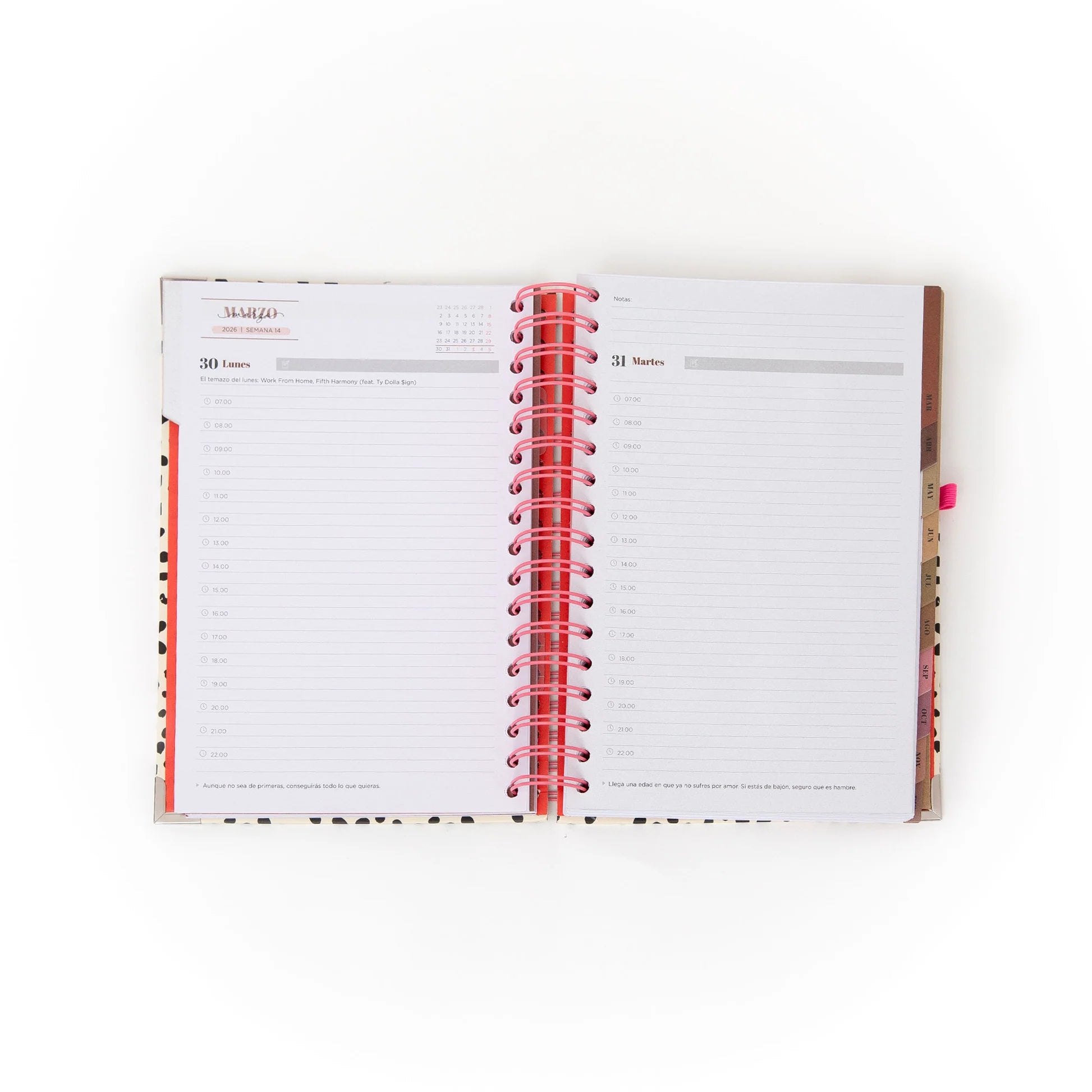 Una agenda diaria con un diseño más sobrio y contenido, pensada para quienes buscan organización y funcionalidad con un estilo elegante. Ideal para acompañarte durante todo el 2026, combina planificación diaria, frases motivadoras y detalles cuidados que hacen del orden una experiencia práctica y agradable.