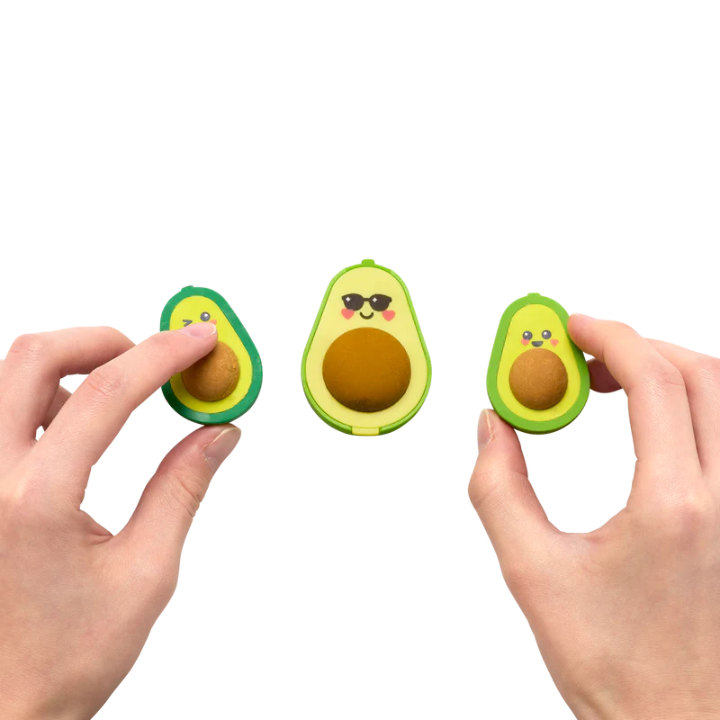 ¿Qué es verde y toneladas de diversión? ¡Este trío de lindos amigos aguacates que están listos para la escuela! 2 gomas de borrar con forma de aguacate y un sacapuntas más grande con forma de aguacate.