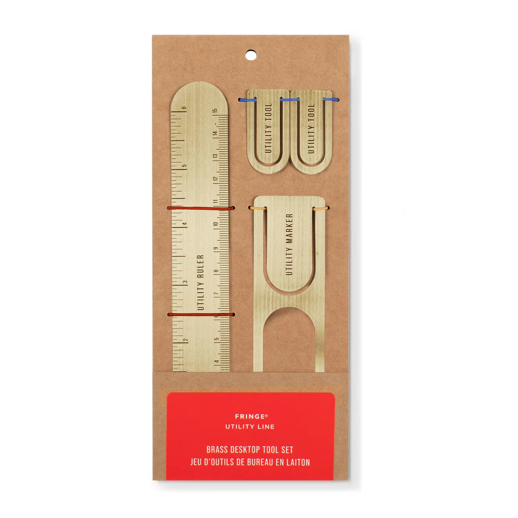 Conjunto de herramientas de escritorio fabricado en latón cortado a láser con detalles grabados que reflejan precisión y calidad. Incluye una regla de 15 cm, un marcapáginas y dos clips, proporcionando todo lo necesario para organizar y optimizar tu espacio de trabajo. Cada pieza combina funcionalidad con un acabado elegante y duradero.