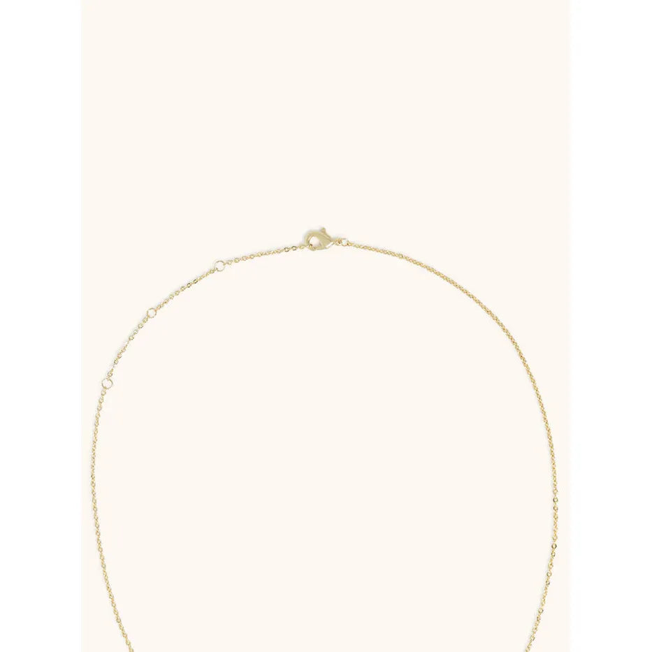 - Tiene una brillante cadena de 16 pulgadas chapada en oro de 14 quilates con una extensión de 3 pulgadas