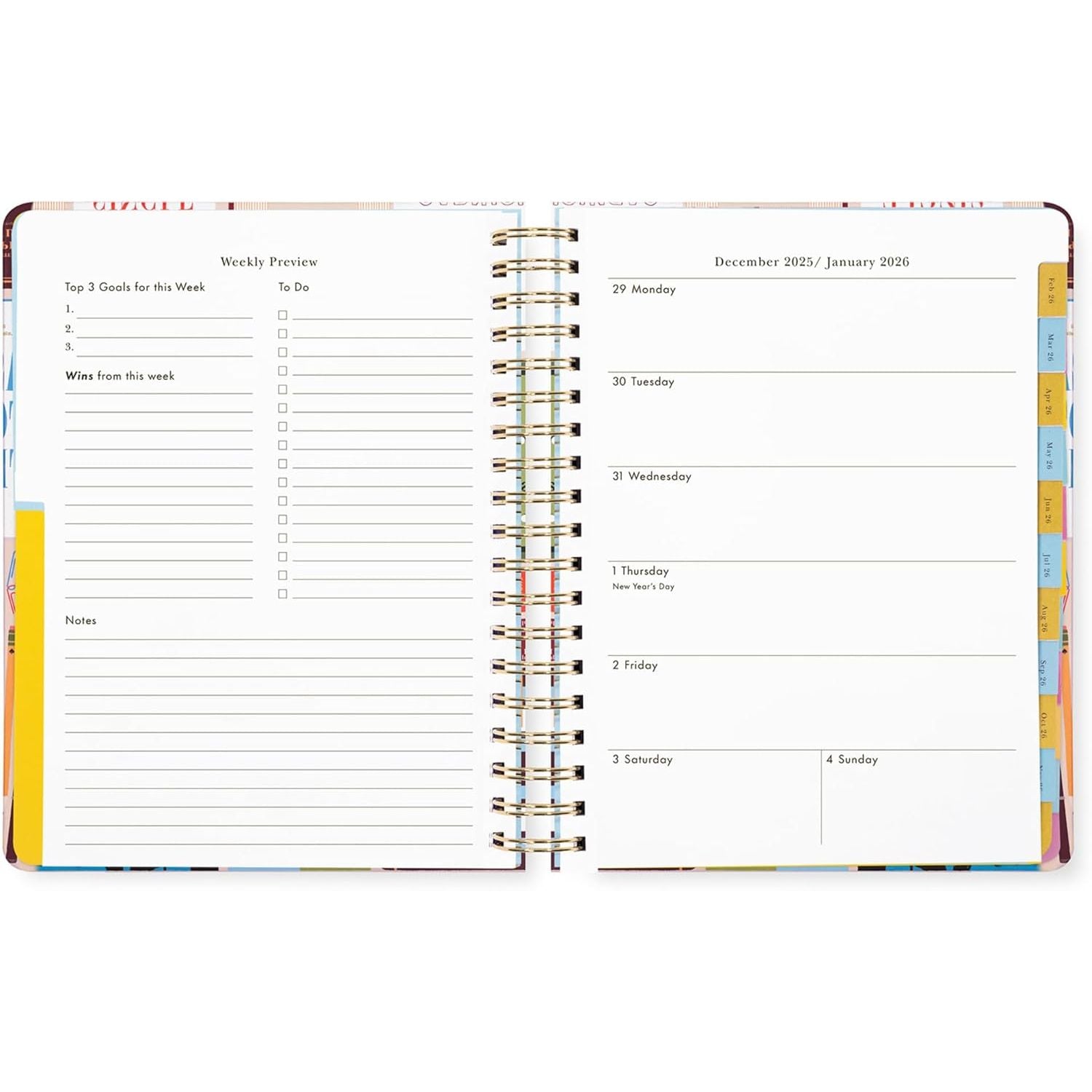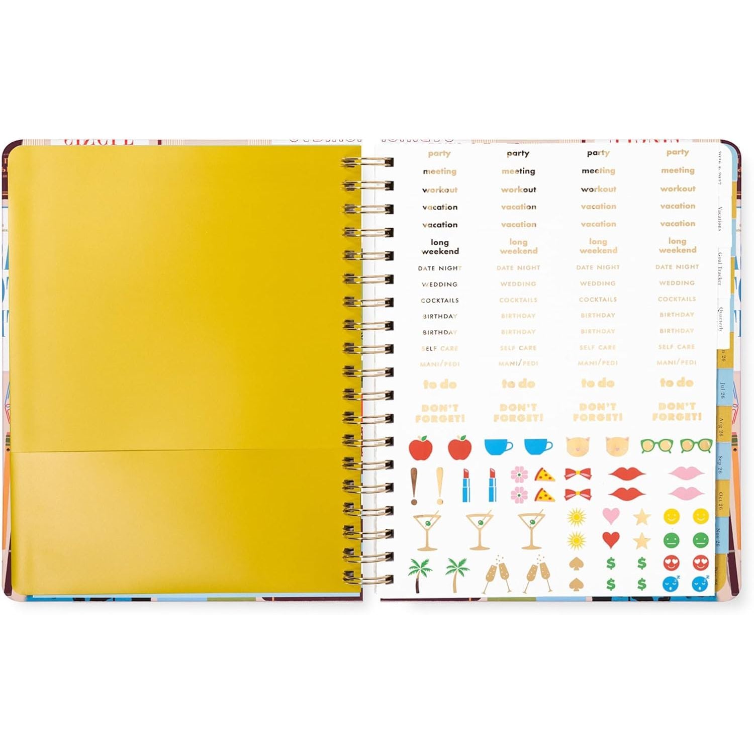- Incluye vistas mensuales, stickers, bolsillos interiores, cierre elástico, chequeos trimestrales y control de metas