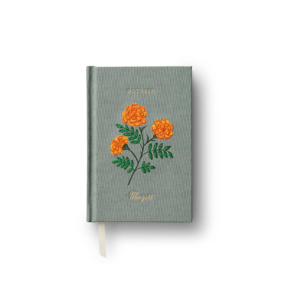 Un minidiario de tapa dura, bordado con un trío de caléndulas doradas, la tradicional flor de nacimiento de Octubre. Su diseño compacto y sofisticado te invita a plasmar tus ideas y momentos especiales con estilo. Perfecta para quienes buscan un toque de distinción y significado en sus notas diarias.