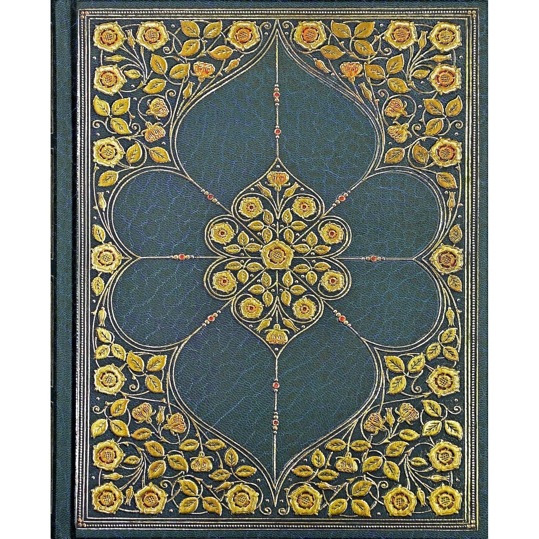 El diseño de esta magnífico libreta se basa en una encuadernación con joyas creada alrededor de 1910 para una edición iluminada de La dama de Shalott de Tennyson. Los maestros encuadernadores Sangorski & Sutcliffe repujaron cuero verde azulado con un jardín de rosas y luego doraron cada flor.