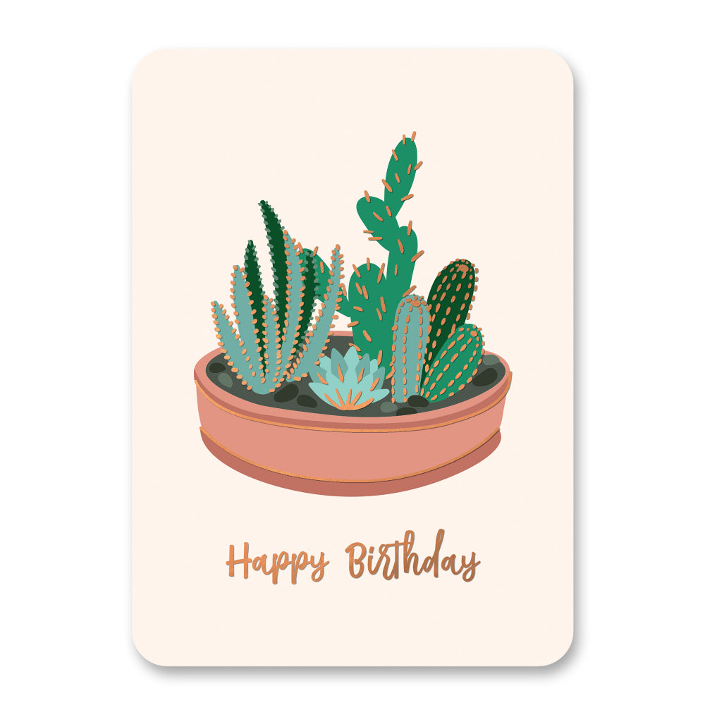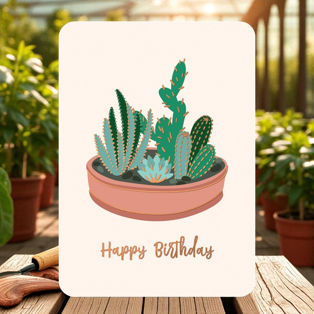 Celebra momentos especiales con esta tarjeta de cumpleaños decorada con hermosas suculentas. Incluye un sobre a juego para que puedas enviar tus mejores deseos con estilo y originalidad. Perfecta para transmitir cariño y alegría en cualquier ocasión, esta tarjeta hará que tu mensaje destaque y sea recordado.