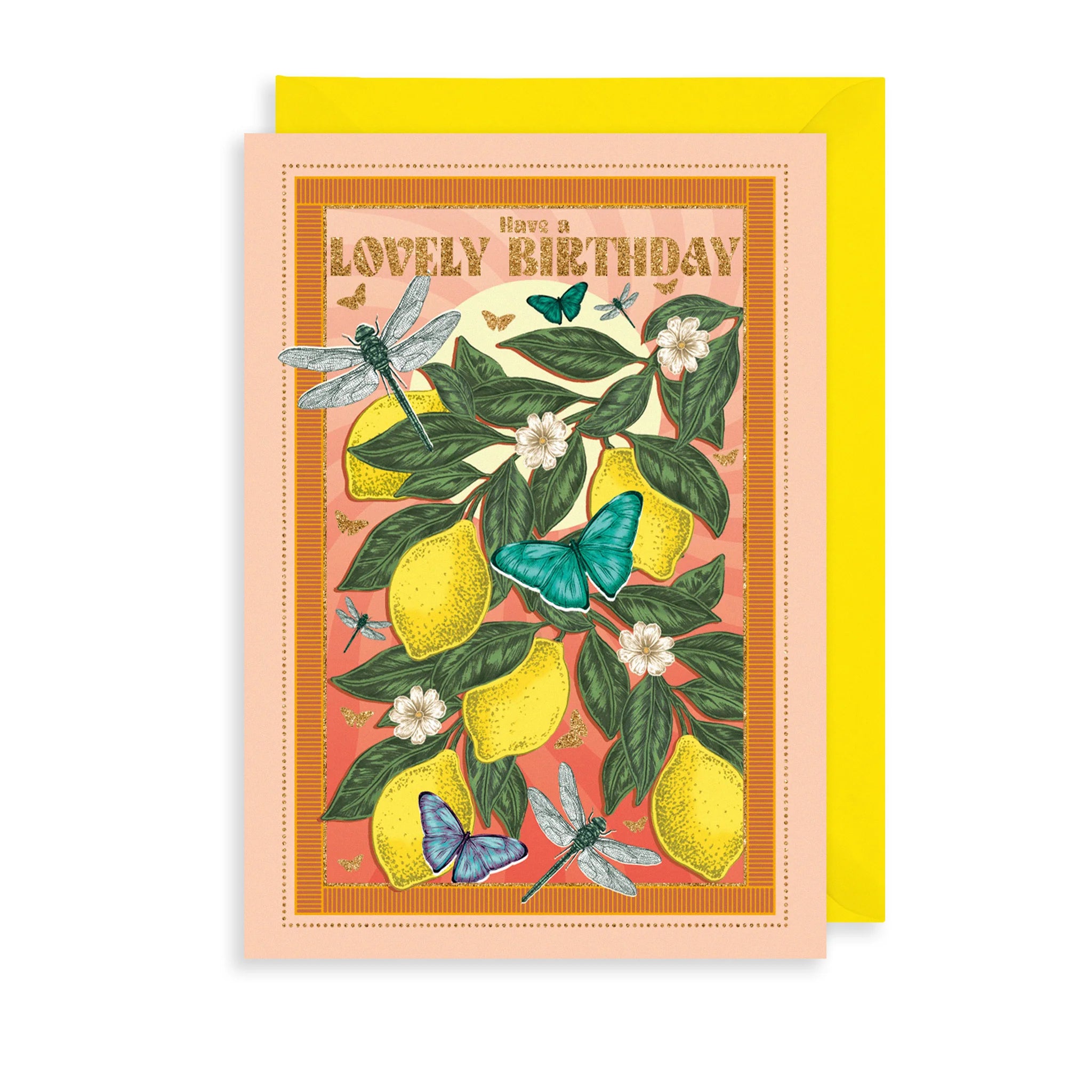 Di feliz cumpleaños con esta preciosa tarjeta. Esta tarjeta presenta pájaros posados sobre elementos botánicos y dice "Feliz cumpleaños, que tu día esté lleno de sol".