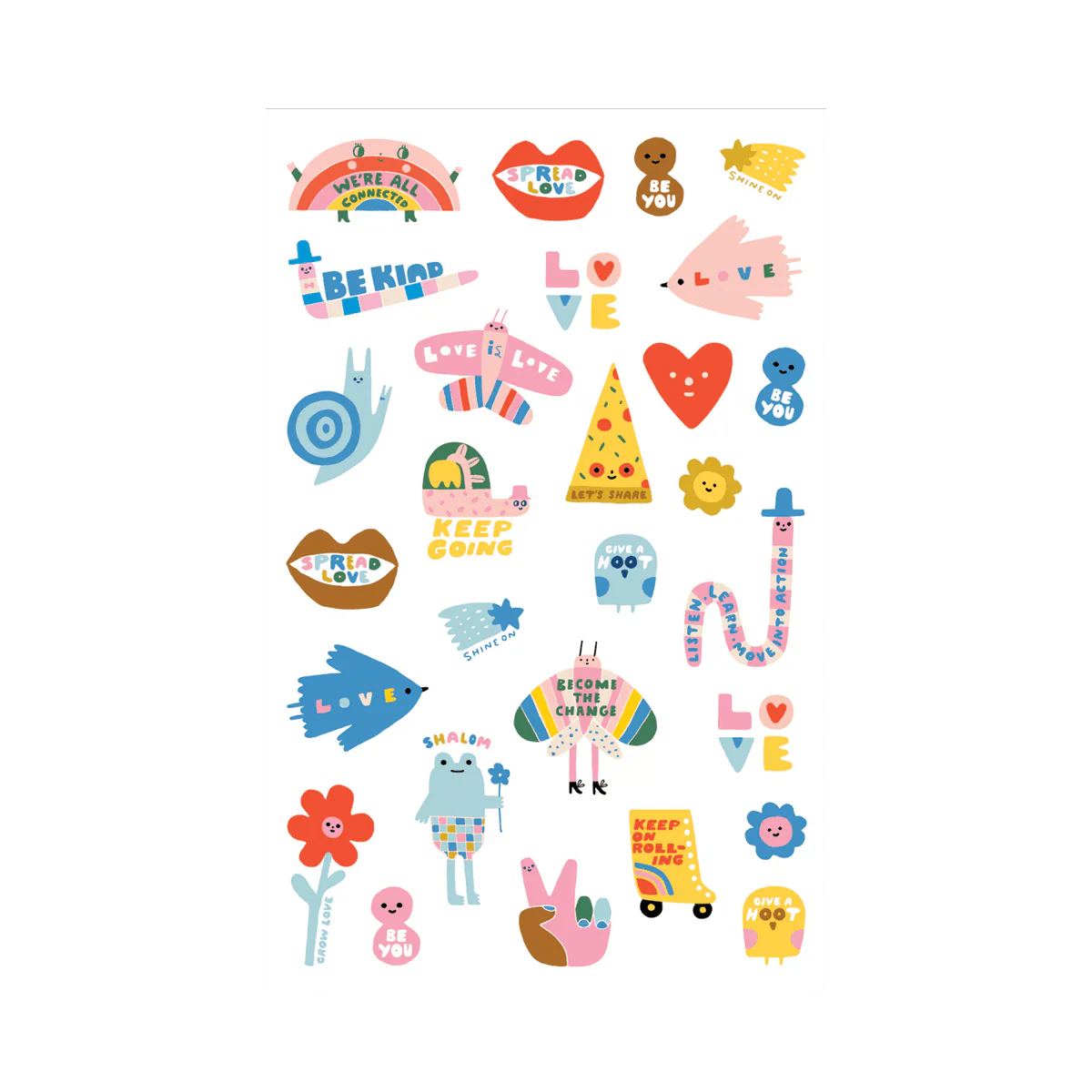 - Personajes con mensajes positivos como "sé amable" y "amor".