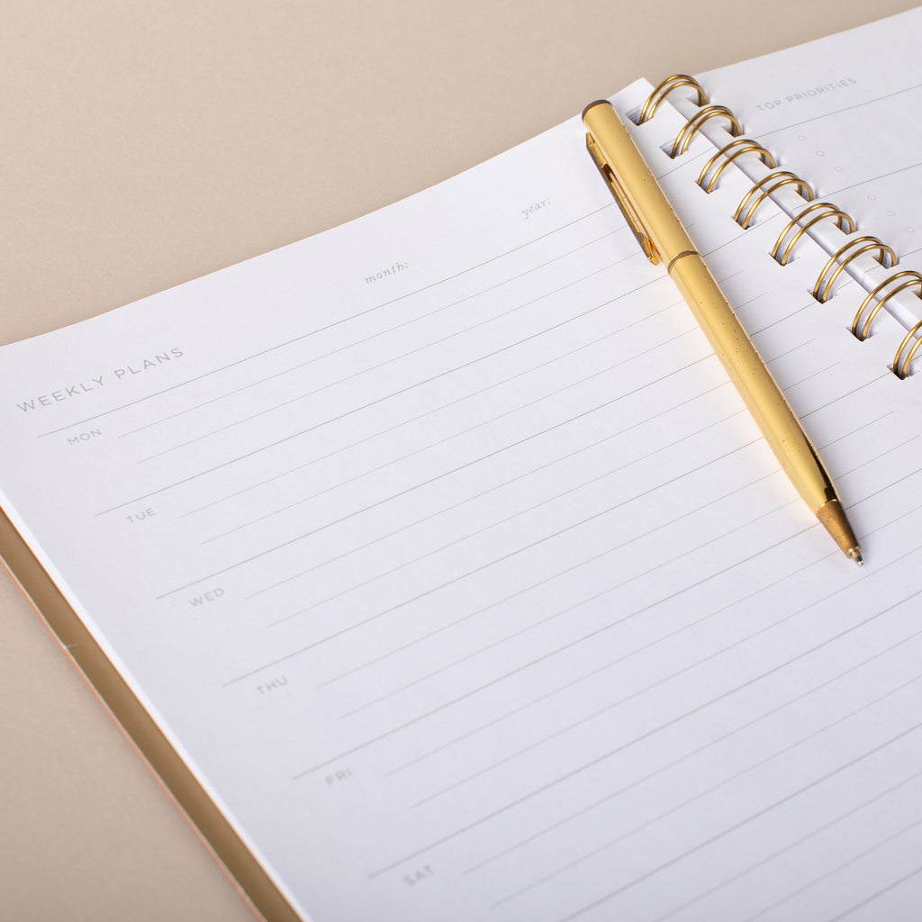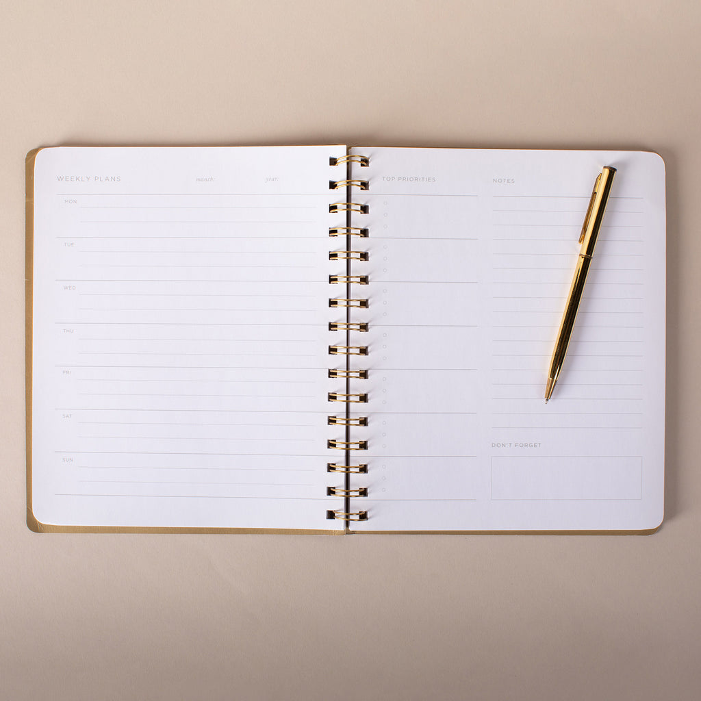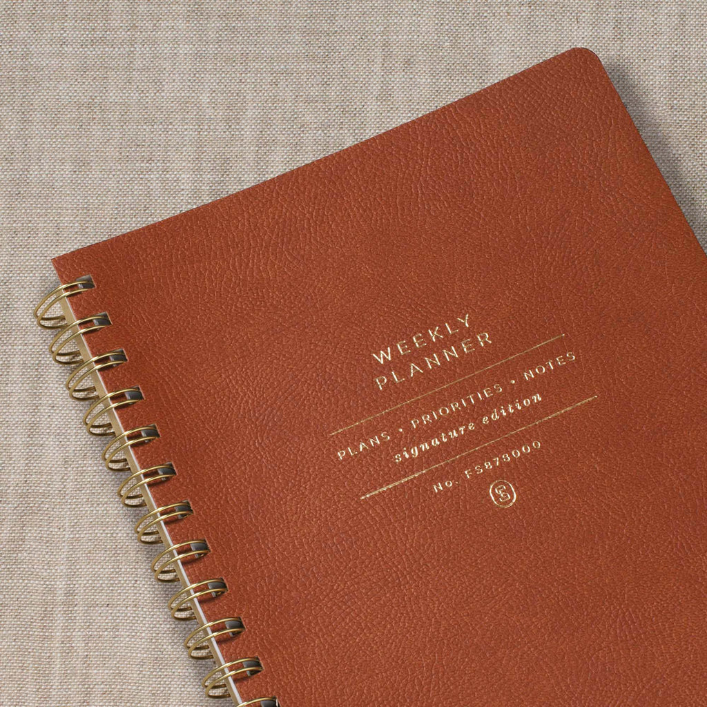 Nuestra Agenda Sin Fecha Cognac Semanal con cubierta de cuero sintético, presenta una obra original de Fringe, un diseño en lámina dorada metálica, páginas semanales con indicaciones y encuadernación de anillas dobles. ¡Eleva cualquier espacio de trabajo con un aspecto práctico, sofisticado y duradero!