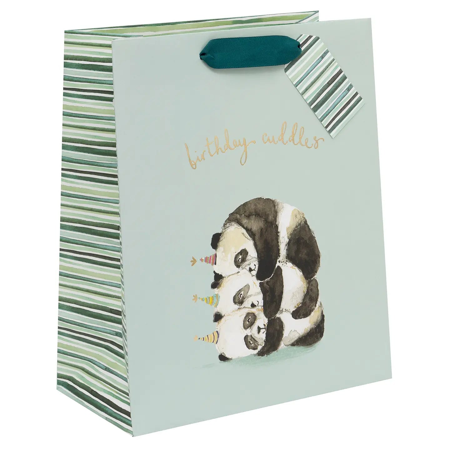 Celebra momentos especiales con esta bolsa grande decorada con adorables pandas que transmiten abrazos y ternura, perfecta para dar un toque cálido y alegre a tus regalos de cumpleaños.