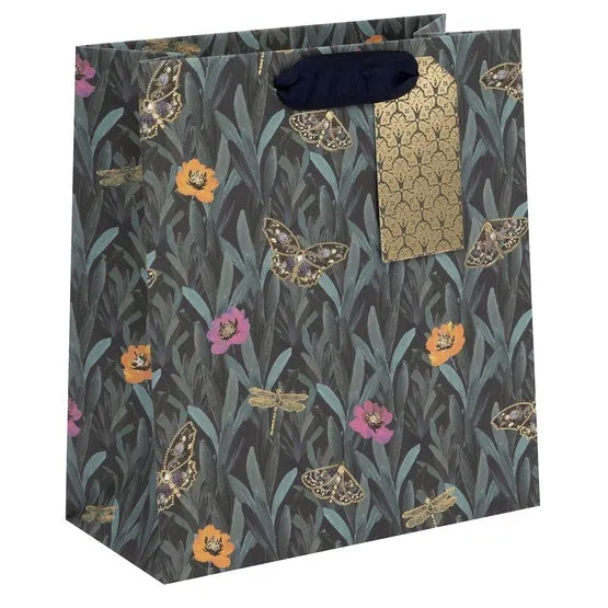 Esta sofisticada bolsa de regalo añade un aire de misterio y elegancia a cualquier obsequio. Su diseño oscuro con delicadas mariposas, libélulas y flores en tonos vibrantes crea un contraste espectacular, mientras los detalles en dorado aportan un toque de lujo. El asa de cinta y la etiqueta dorada grabada completan el diseño, ofreciendo una presentación impecable y llena de encanto. Perfecta para regalos que merecen una presentación especial, esta bolsa no solo envuelve, sino que realza la belleza del gesto.