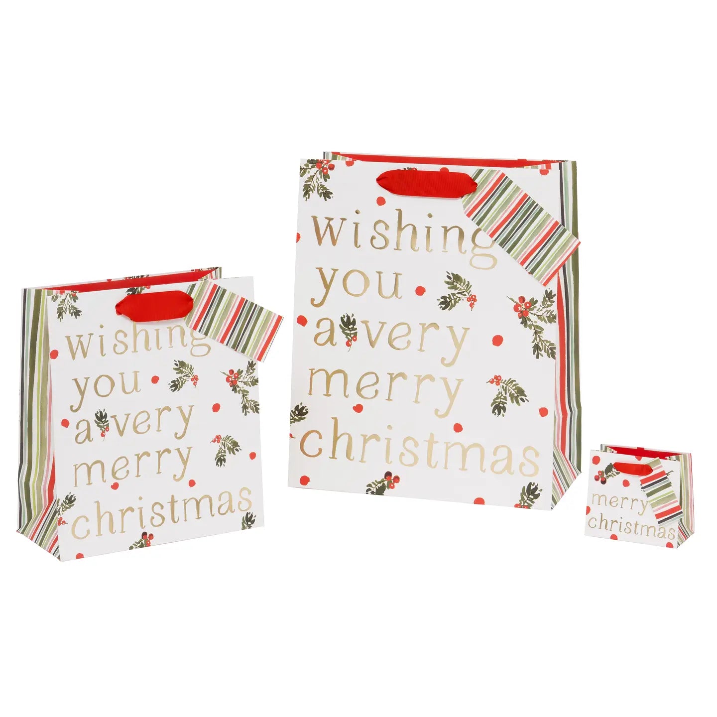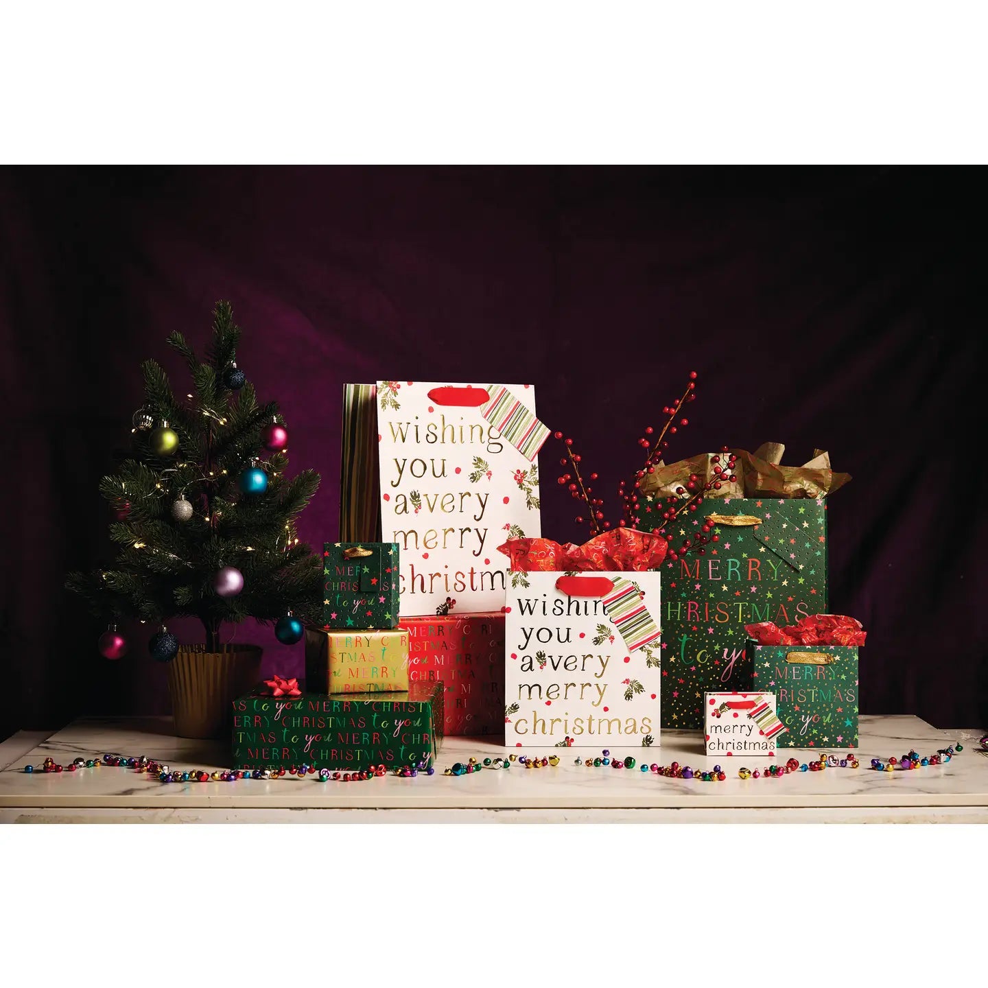 Una encantadora bolsa de regalo mediana con diseño navideño alegre y festivo. Presenta el cálido mensaje “wishing you a very merry christmas” en letras doradas con detalles de muérdagos y puntos rojos, acompañada de rayas en tonos verde, rojo y blanco en los costados. Sus asas de cinta roja añaden un toque tradicional, perfecta para que tus regalos destaquen por su espíritu navideño.