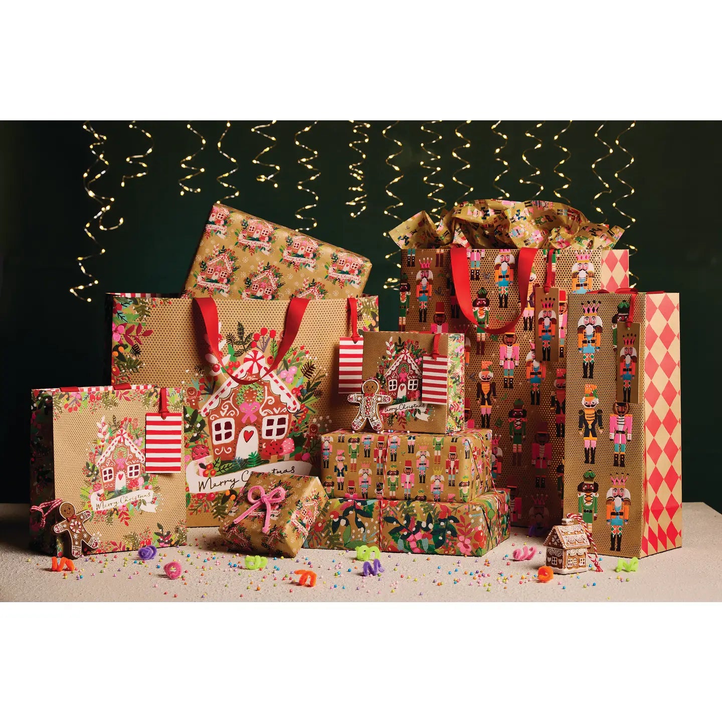 Esta bolsa de regalo tiene un diseño alegre y original inspirado en el Cascanueces, con figuras coloridas sobre un fondo kraft natural. Las asas de cinta roja y la etiqueta a juego le dan un toque festivo sin perder ese aire artesanal. Es ideal para envolver tus regalos más grandes, combinando perfectamente el encanto tradicional de la Navidad con un estilo moderno y cálido.