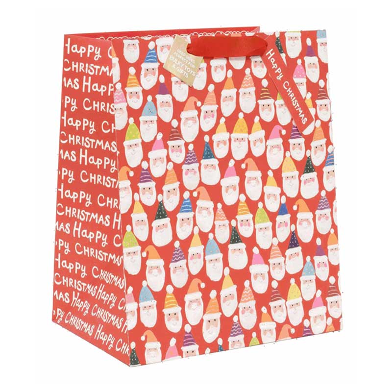 Esta bolsa de regalo de tamaño shopper está cubierta con un alegre diseño de Santas en tonos festivos. Su fondo rojo brillante y sus asas de cinta combinan perfectamente con el espíritu navideño. Ideal para envolver regalos voluminosos o juguetes, añade un toque divertido y colorido al arbolito.