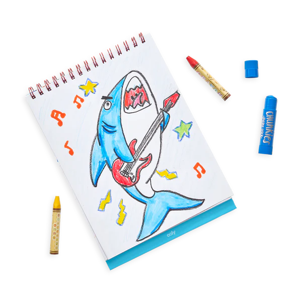 Tiburones, naves espaciales y guitarras rockeras forman una atractiva portada para un cuaderno de bocetos destacado. ¡El cuaderno de bocetos Awesome Doodles no sólo tiene espacio para muchos bocetos, sino que también los mostrará! Este extraordinario cuaderno de bocetos tiene su propio soporte tipo caballete incorporado. ¡Con la divertida tapa laminada con detalles de garabatos, la inspiración comienza aquí!
